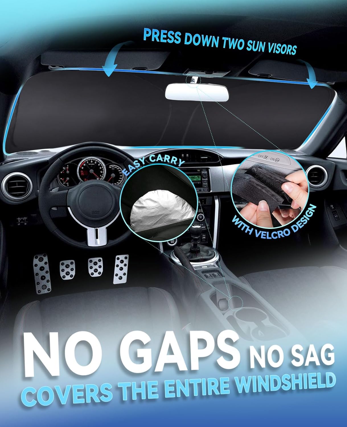 - [QUICK AND EASY SETUP] The Double round steel ring design allows you to prop the sunshade up on windshield with a velcro will easily and fold-away closure into a small circle storage in pouch. The windshield sunshade can be folded and stored in the storage pouch,which is easy to store and carry at any time.