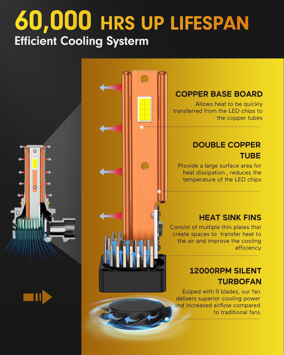 - 【Efficient Cooling for Long Life】HB3 HB4 headlight bulbs feature an aviation-grade aluminum alloy shell and a high-speed silent fan with a speed of 18,000 RPM,This product is a light emitting diode (LED) headlight modification kit and/or headlight component. The LED headlight modification kit and/or headlight components used for road vehicles must comply with the Federal Motor Vehicle Safety Standard . improving reliability and extending service life by maintaining optimal temperature during continuous driving conditions.