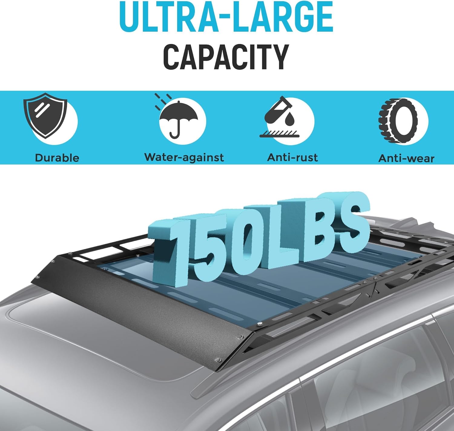 - Dimensions: The size of this roof cargo basket is 50-3/8 in(L) x 39in(W) x 4-5/8 in(H). It can carry a weight of 150 lbs