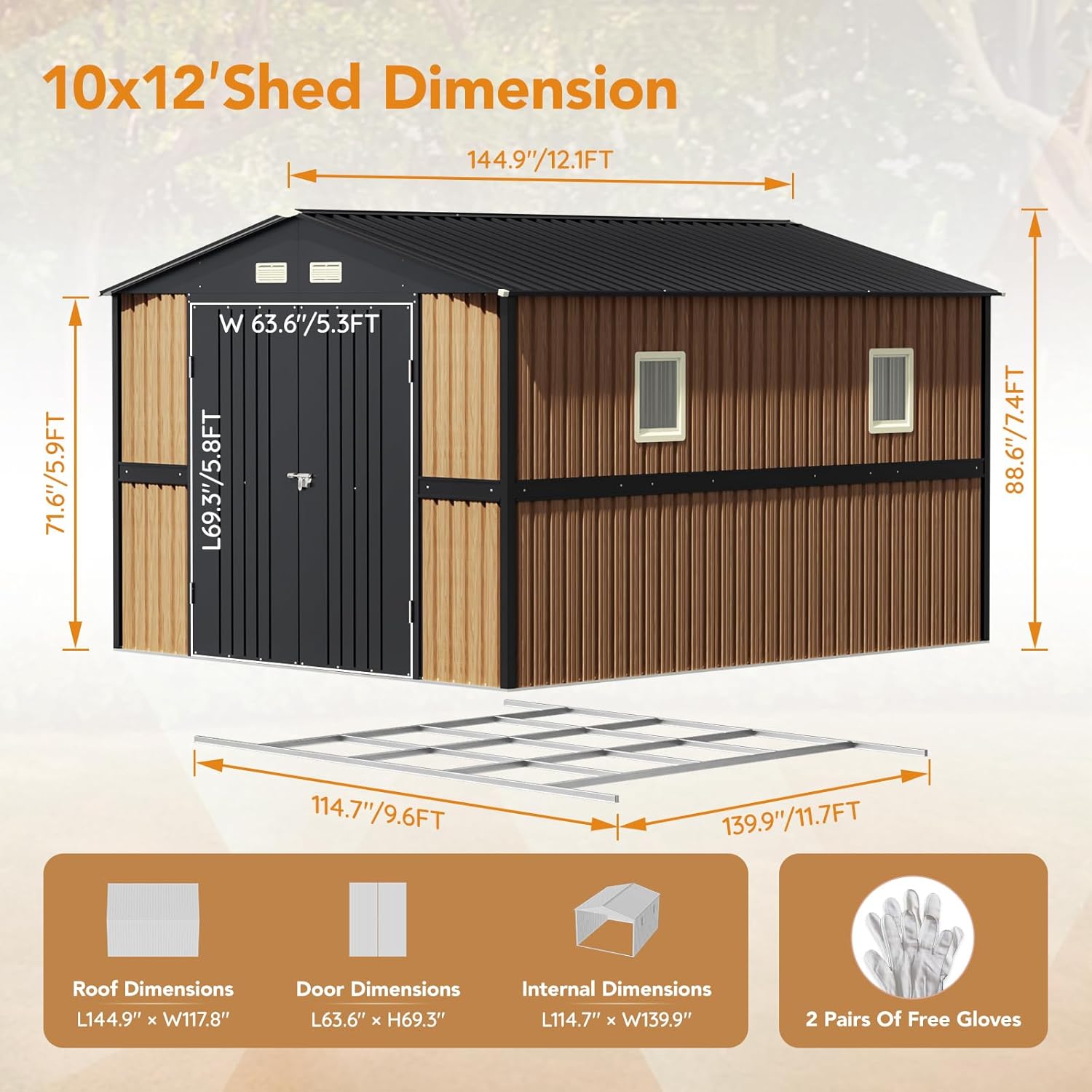 - [Large Size with Maximum Storage]The actual dimensions of our 10x12 FT tool shed are 9.6 x 11.7 FT (115 x 140 Inch), providing ample space for your garden tools and outdoor equipment. While named for convenience, the precise measurements are detailed in the product image for your reference.Scientific Height -Max height is 88.6'' ,which for most people can stand inside.