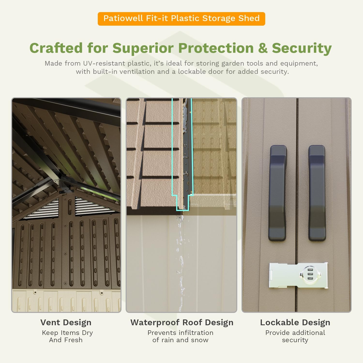 Patiowell 8 x 8 FT Plastic Outdoor Storage Shed with Floor, Resin Shed with Window and Lockable Door for Garden, Backyard, Tool Storage Use, Easy to Install in Brown (Kick-it Shed)