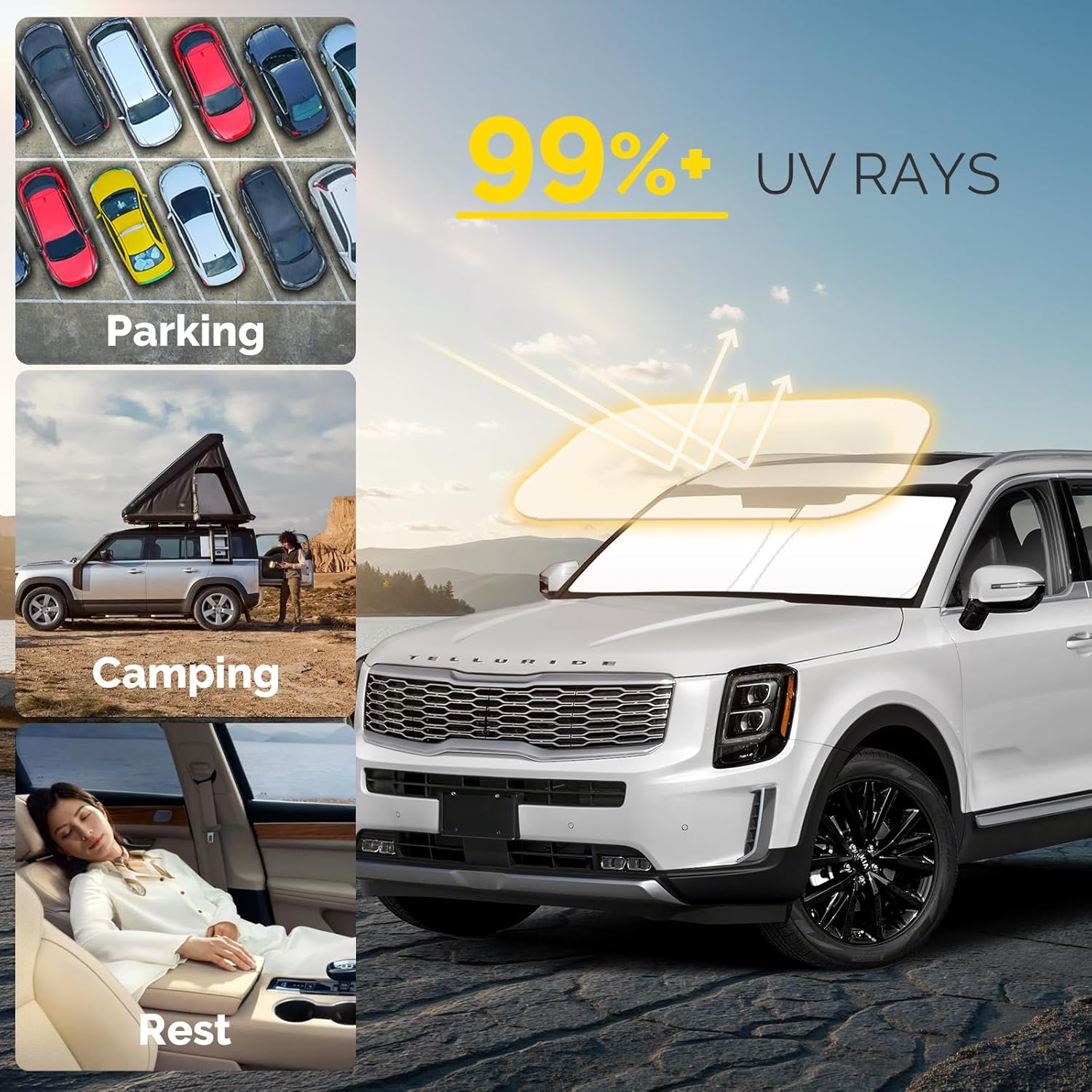 - 【Easy Installation】This for 2024 Kia Telluride accessories sunshade can be easily fixed in your car without any tools. Unfold sun shield for car windshield and place it in front of the windshield inside the car, and fix it with the car sun visor.