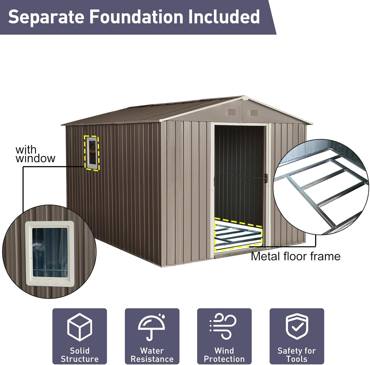 8x10 FT Outdoor Storage Shed, Metal Garden Shed with Frame Floor, Outside Tool Shed with Window, Waterproof Storage Building with Lockable Sliding Doors & Sloped Roof for Backyard, Patio, Warm Gray