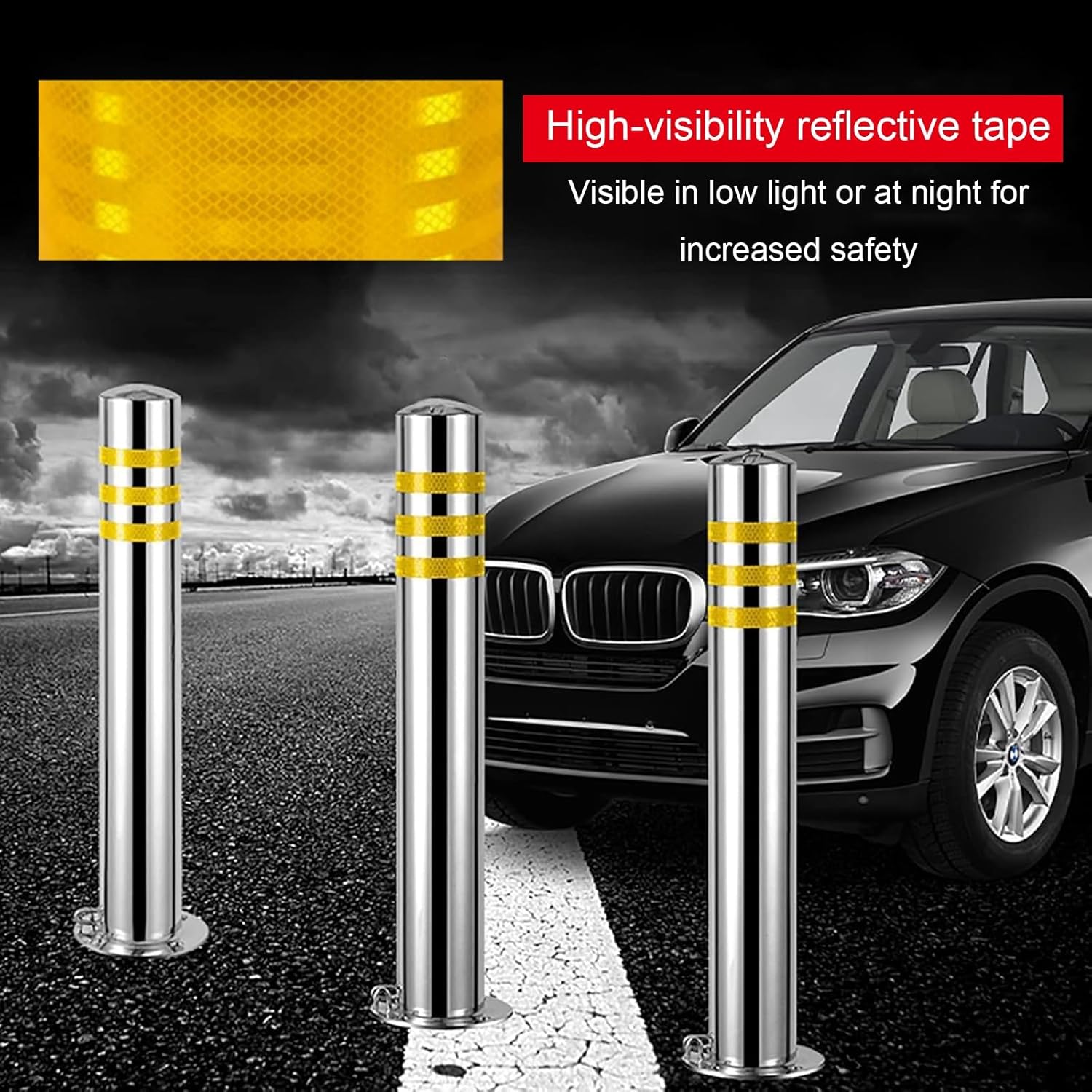 - 【High-Brightness Surface】: The parking barrier posts with yellow reflective film, which can be seen even in low light conditions such as at night or in bad weather conditions. Parking bollard posts effectively guide and control the order and safety of vehicle and pedestrian traffic.