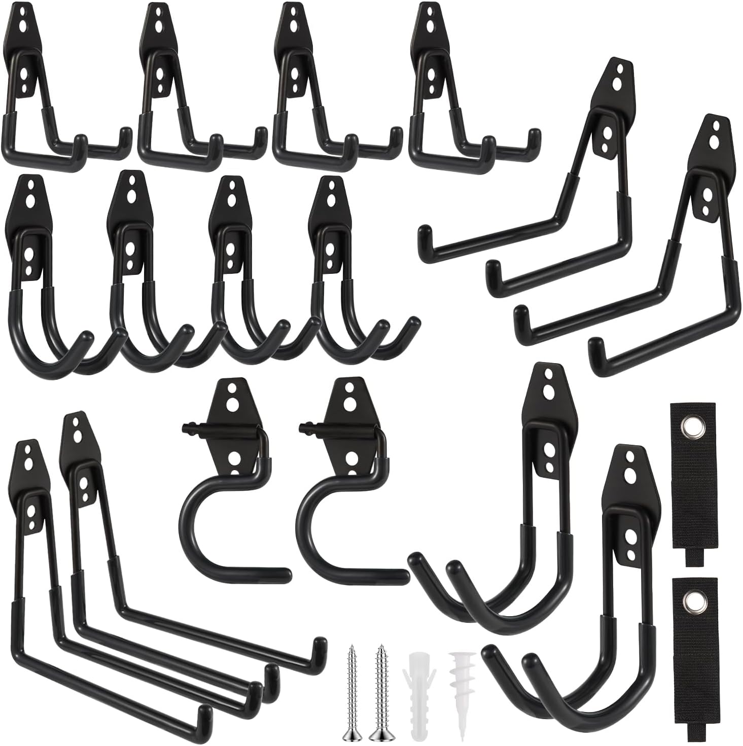 - ZexHok Wall Hook Assortment Set: 18 pack storage hooks organizer include with 6 sizes: 4pcs small J hooks, 4pcs small U hooks, 2pcs large J hooks, 2pcs middle U hooks, 2pcs large U hooks, 2pcs S hooks and 2pcs straps for hanging tools of different sizes and weight.