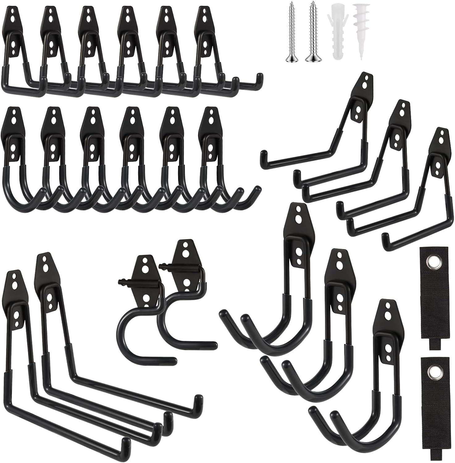 - ZexHok Wall Hook Assortment Set: 24 pack storage hooks organizer include with 6 sizes: 6pcs small J hooks, 6pcs small U hooks, 3pcs large J hooks, 3pcs middle U hooks, 2pcs large U hooks, 2pcs S hooks and 2pcs straps for hanging tools of different sizes and weight.