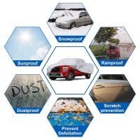 - 【upgrade material】--1. Using the latest KouKou multilayer heavy and safe material, full exterior covers has a very high resistance to impact and abrasion resistance, 100% waterproof. 2. Silver appearance has the advantages of good heat preservation and UV protection. Keep the car cool in the summer. 3. The lining material is very soft and the friction coefficient is very low to protect your car paint. koukou multi-layer material is much thicker and more durable than other similar products.