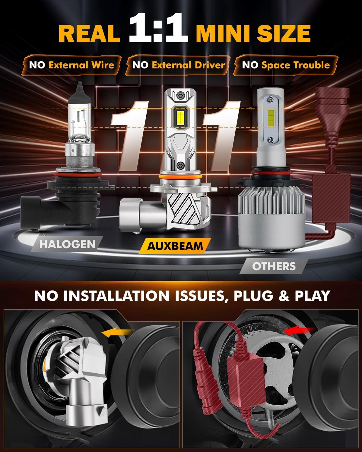 Auxbeam 9005 9006 Fog Light, Super Bright 1:1 Mini Size 6500K White, 9005 9006 Fanless Replacement For Off-road Use Or Powersports, Plug and Play, Pack of 2