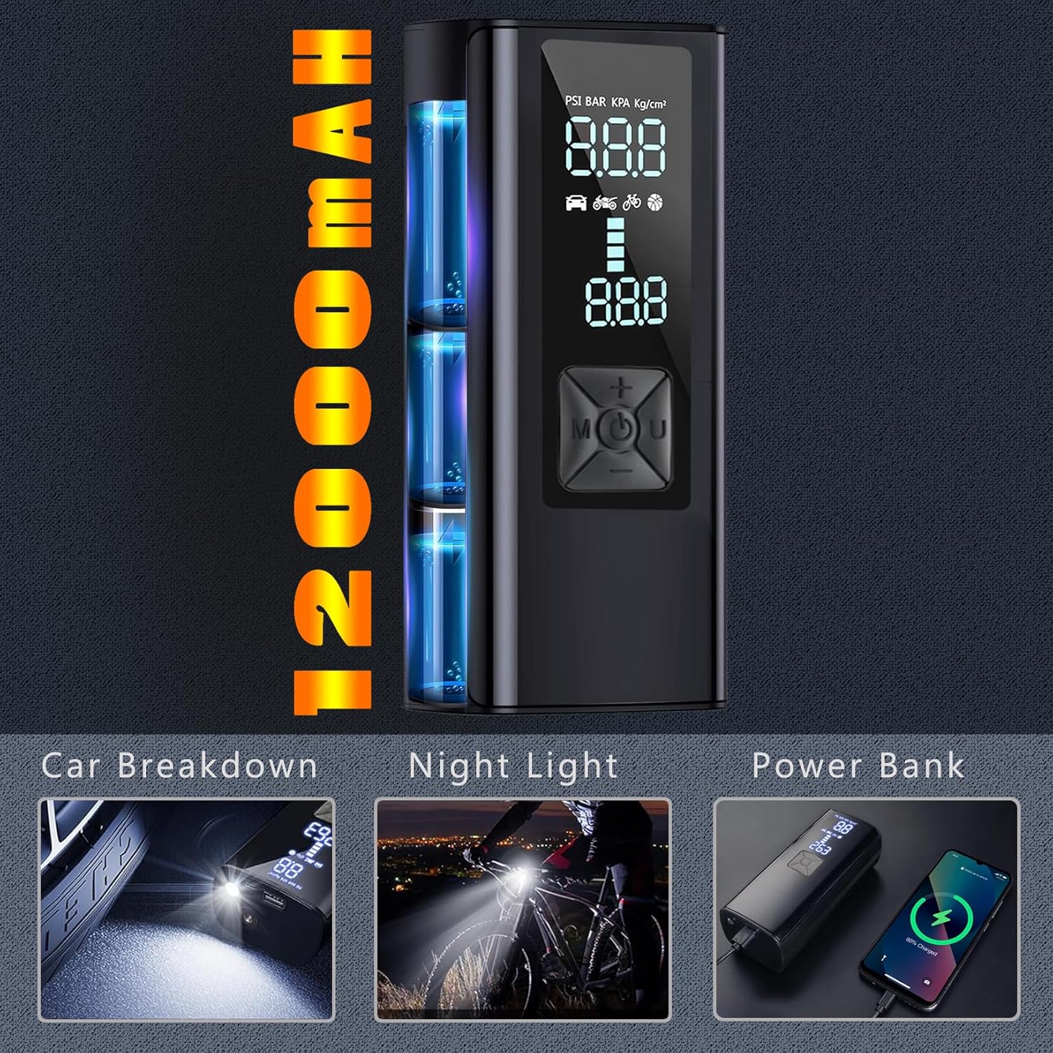 - 【Portable Tire Inflator For Car】: Easily change between PSI, kPa, BAR, and KG/CM pressure units with a push of a button;Easy to read large LCD;Digital Tire Pressure Gauge;Built-in LED flashlight for low light conditions;Deflate button for decreasing pressure;Air Hose stores inside;Powerful 2000 mAh rechargeable battery with fast recharging