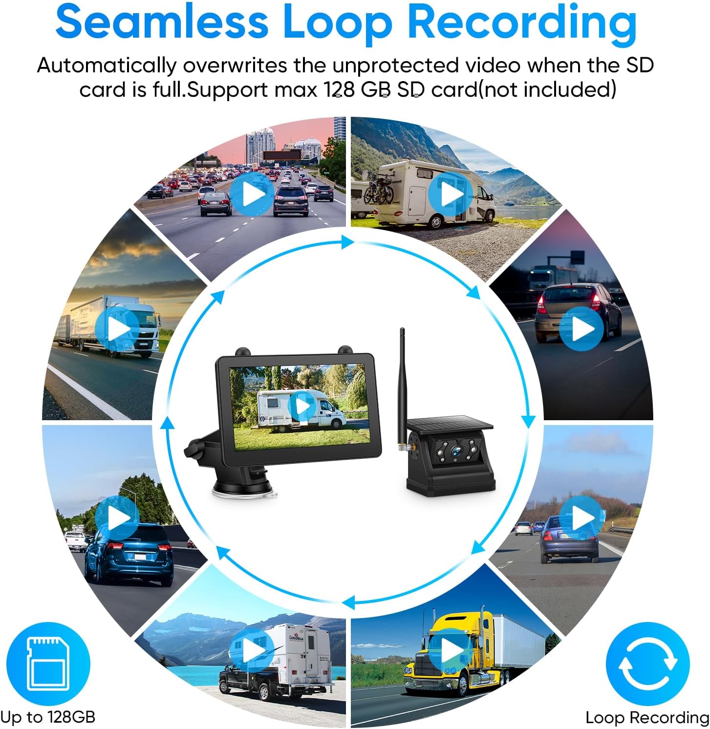 Magnetic Solar Wireless Backup Camera System with 7" IPS Touchscreen Monitor, 2K Rechargeable Auto On Off Rear View Camera with DVR Loop Recording for RV, Camper, Trailer, Trucks