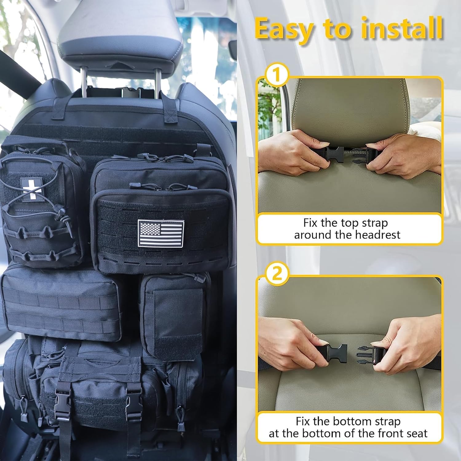 - ๐ Easy Installation - With adjustable strap,easily adjust to fit around your headrest and at the bottom between the seat back and base.Each Molle bags has been designed with velcro tape and buckle, each pouch is flexible to be added or removed.
