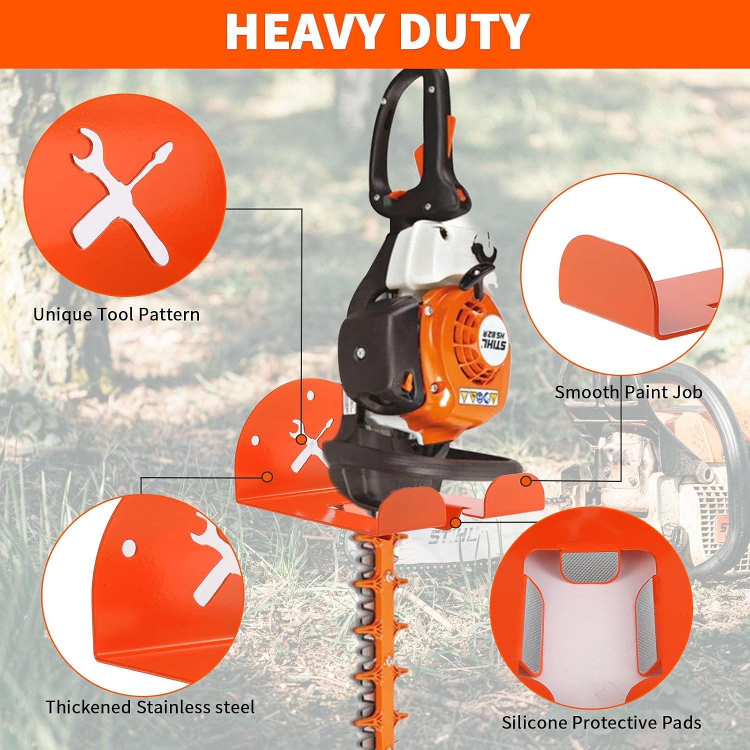 - [Heavy Duty] Iulrtba weed eater hanger brackets are constructed of 5/64" thickened 12 gauge stainless steel, which can handle up to 110 lbs and give you total confidence that your equipment is securely stored. Each wall mounted grass trimmer rack is powder coated in durable orange paint, which perfectly matches the color scheme of Stiehl tools. The silicone pads protect your items from scratching or damage when rubbing up against the hook