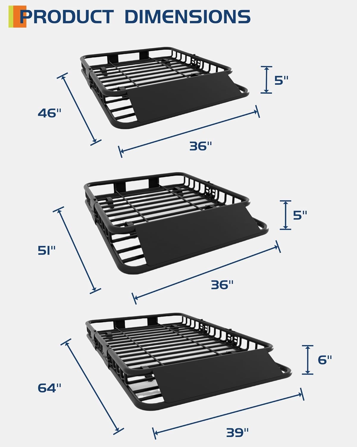 - 【LARGE STORAGE CAPACITY】Free up space in your vehicle with this roof rack cargo basket that can hold up to 200 Lbs. Overall dimensions include: 64"(L) x 39"(W) x 6"(H)