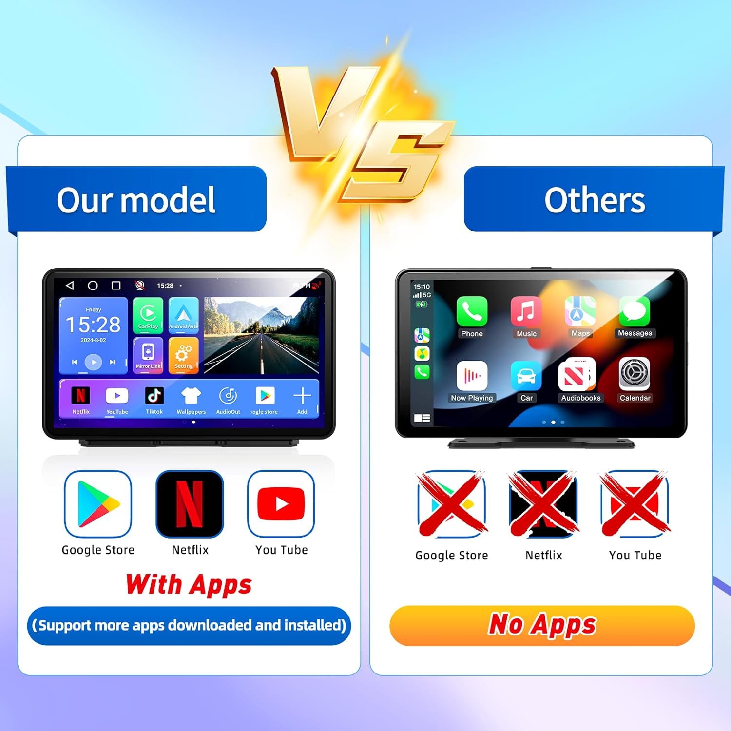 - 🚗PORTABLE DISPLAY AUDIO WITH LATEST ANDROID SYSTEM! 4 Core CPU + 2GB RAM + 32GB ROM Large Storage Experience a new generation of driving] Whenever you connect Wi-Fi, you can always find the latest online maps as well as the most frequently used smartphone Enjoy YouTube, Netflix, and Prime Video videos on your 9” carplay. The 4-core CPU with fast processing power and outstanding performance allows you to run multiple apps at the same time smoothly