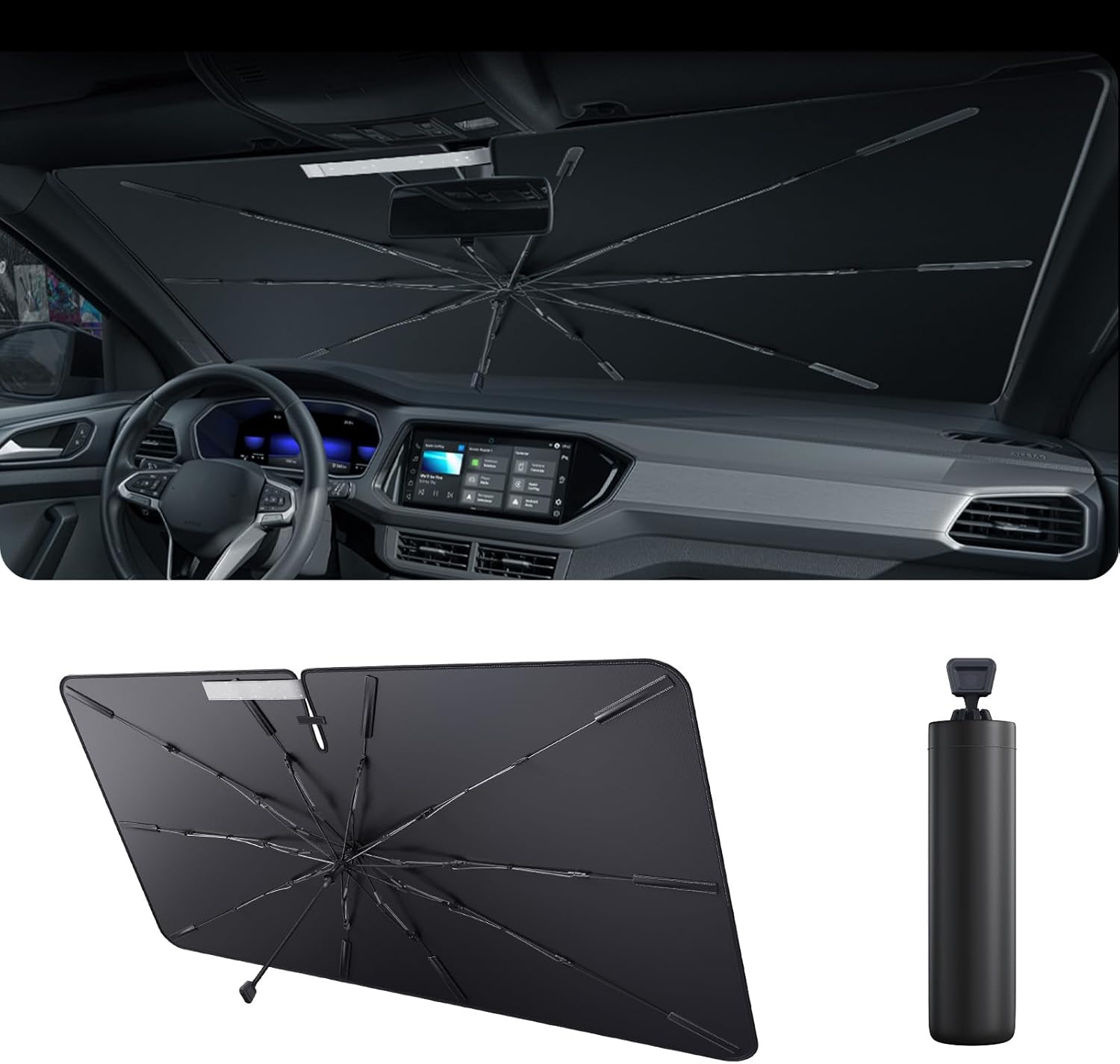- [Convenience Umbrella Design] The car windshield sun shade, similar to an umbrella, it provides easy installation and storage. Windshield sunshade umbrella designed for car owner convenience, it folds in seconds and fits seamlessly into our exclusive holster for easy storage under the seat of your car or in your door pocket. Its user-friendly design ensures effortless sun protection