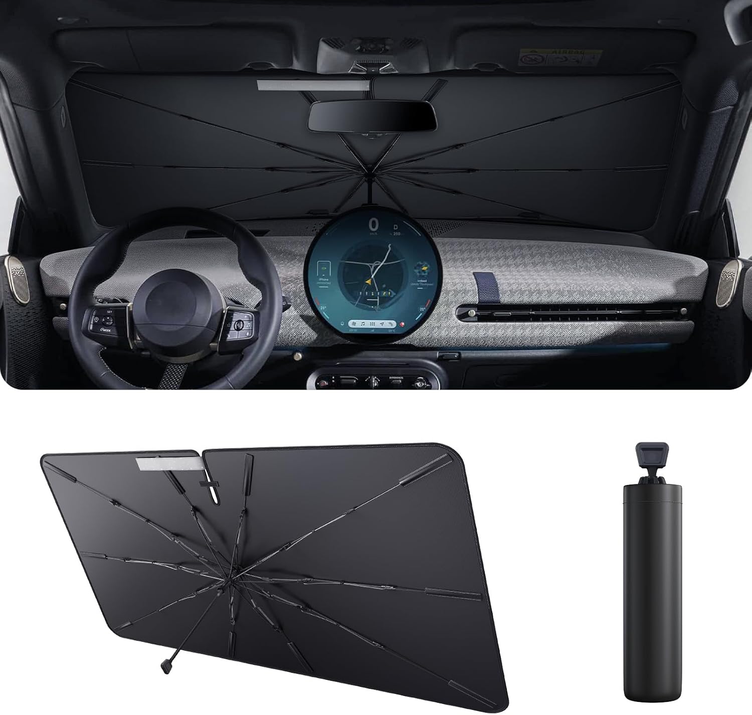- [Convenience Umbrella Design] The car windshield sun shade, similar to an umbrella, it provides easy installation and storage. Windshield sunshade umbrella designed for car owner convenience, it folds in seconds and fits seamlessly into our exclusive holster for easy storage under the seat of your car or in your door pocket. Its user-friendly design ensures effortless sun protection