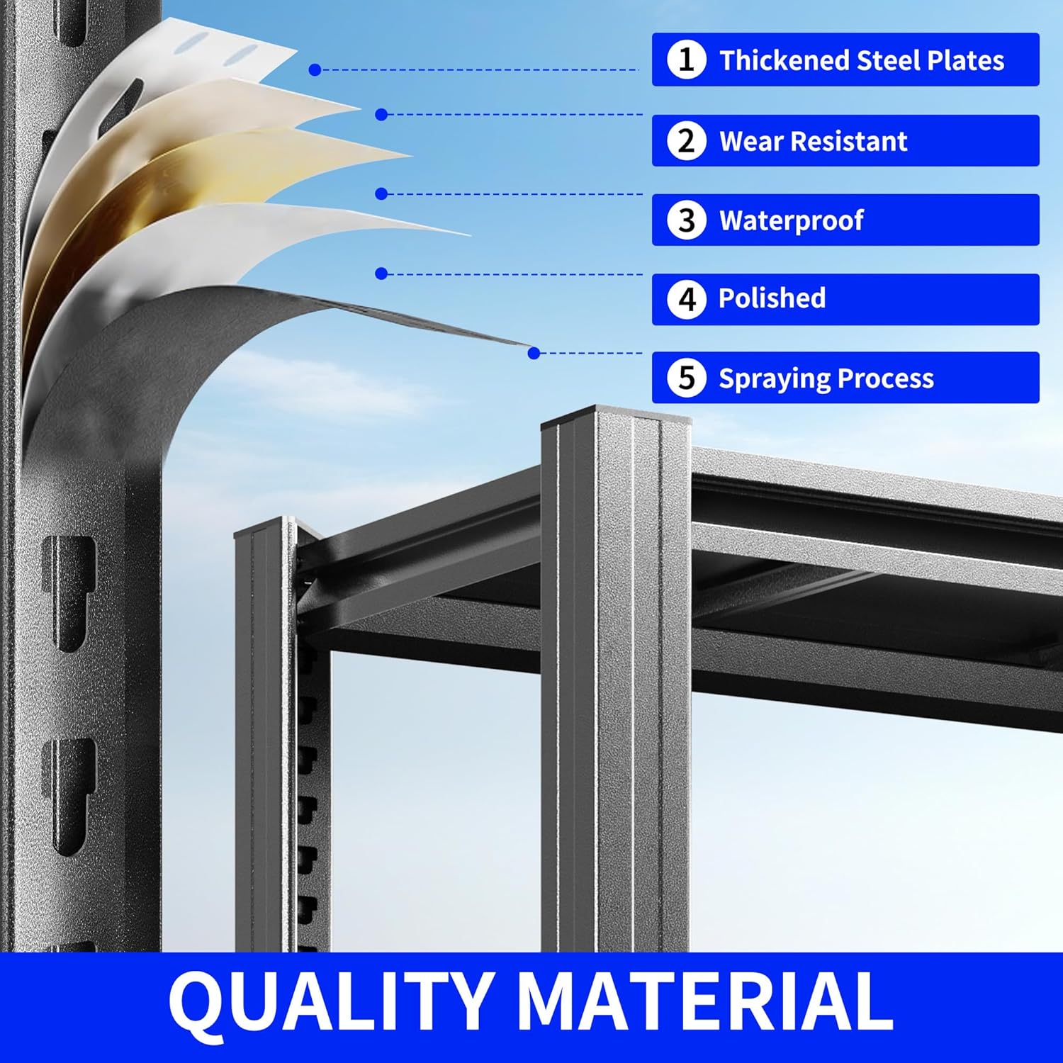 - Thickened and Widened with Strong Load-bearing:This metal storage shelves is made of thickened and thicker double-layer metal columns. Each partition is reinforced with a metal crossbar underneath, which is more stable and sturdy. So each layer of the storage shelving can load 500LBS, and the whole heavy duty rack can load 2500LBS.