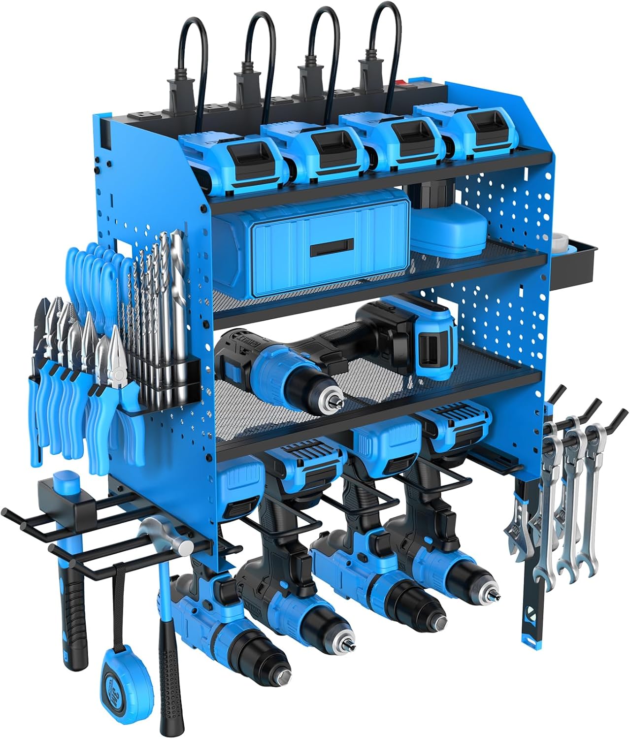 - 【4-Layers Wall Mount Tools Organizer】Power tools organizer comes with 4 drills, 2 hooks, screw & screwdriver organizer, built-in metal power strip. The 4-layer rack can accommodate more tools, and the wall mount design ensures tools storage in the work area and saves your bench space.