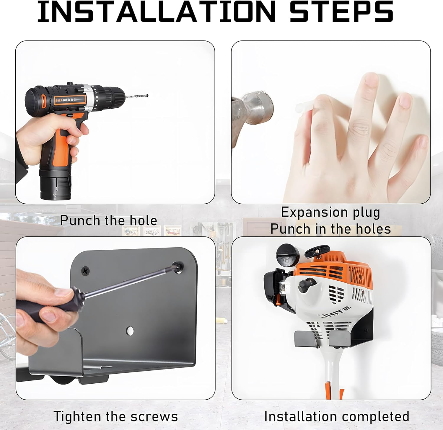 - 【Sturdy & Premium Materials】The weed eater hanger is made of thickened stainless steel, which is stronger and has high bearing capacity. The surface of the racks is sprayed with black paint for double protection. Waterproof and anti-rust, wearproof, resistance to chipping and cracking. Smooth edge cutting does not hurt your hands and tools. Its robust design ensures that your power tools are held securely in place, preventing accidental damage or falls!