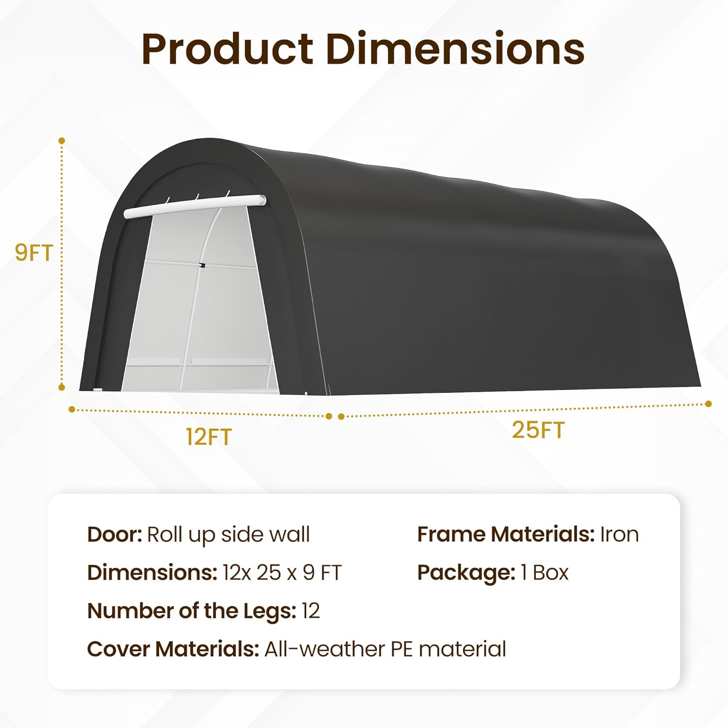 - DOMED CARPORT: 12x25 ft car port dome design prevents water and snow buildup, reducing structural stress and enhancing durability. The sleek, curved shape of the carport is more attractive and provides more interior space and better air circulation