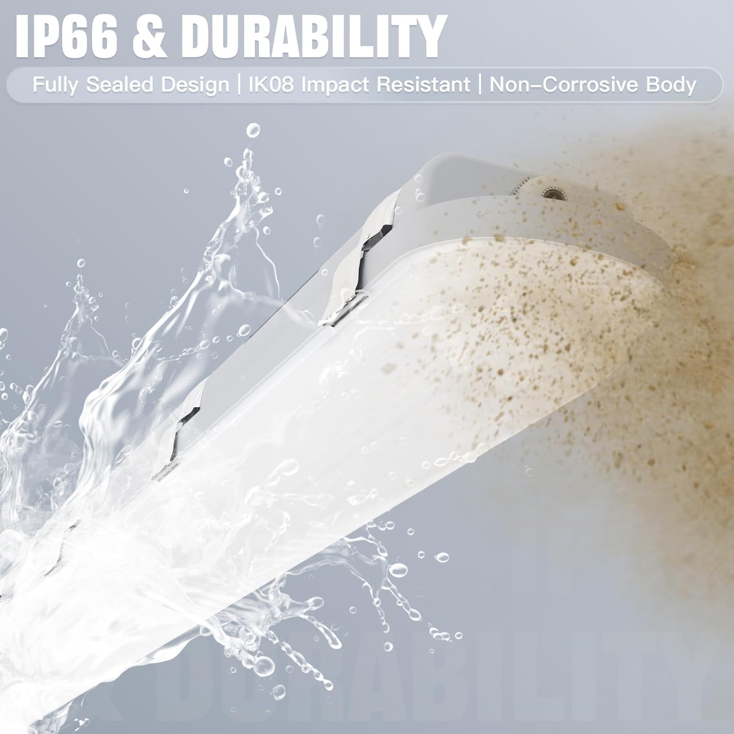 - 【IP66 High Waterproof Level】This 8foot Led light fixtures passed IP66 waterproof testing, IK08 impact rated, and ETL certified. It features a fully sealed polycarbonate lens and non-corrosive body, protecting against dust, dirt, and moisture with a hermetic design. They are also compatible with 0-10V low voltage dimmers (dimmers not included).
