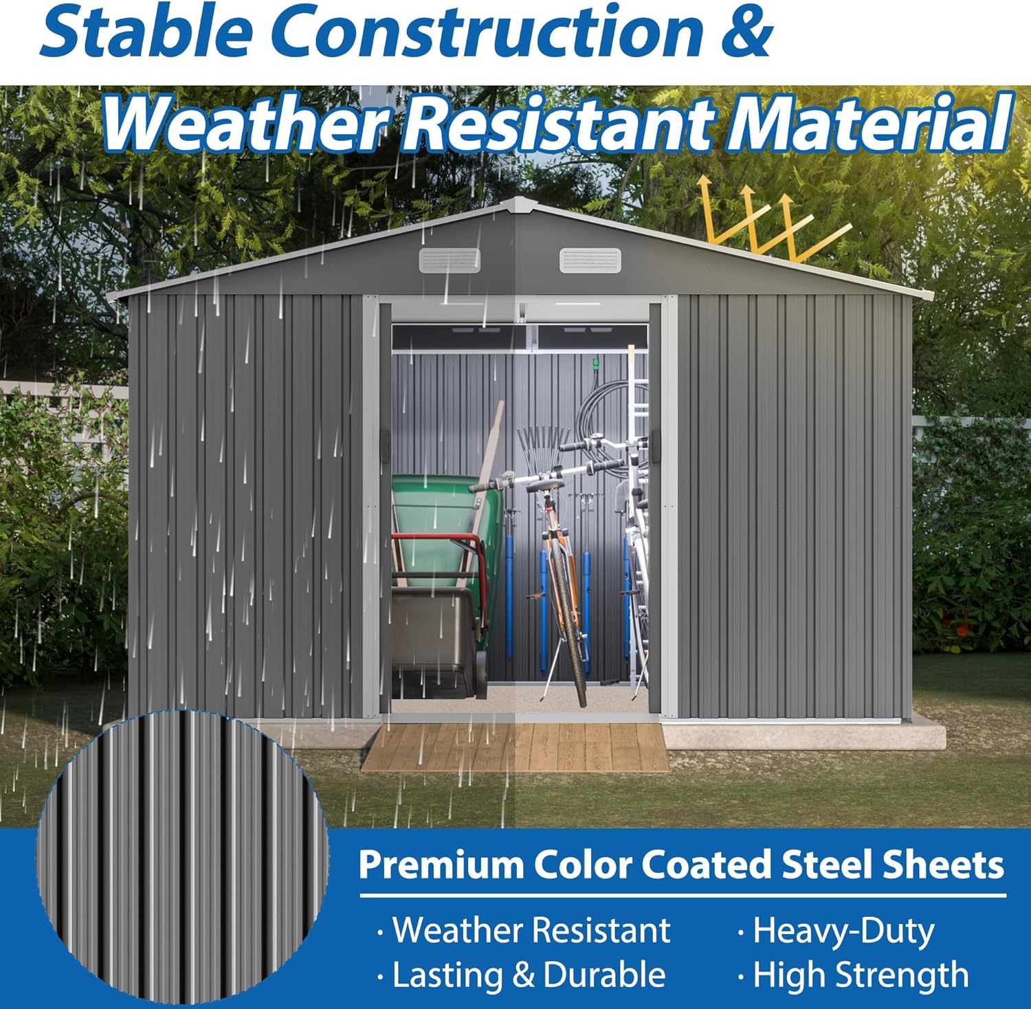 - 【Reinforced Steel Construction】 Built with galvanized steel panels and aluminum frame reinforcements, this storage shed offers exceptional strength, rust resistance, and stability that lasts over 10 years in all weather conditions.