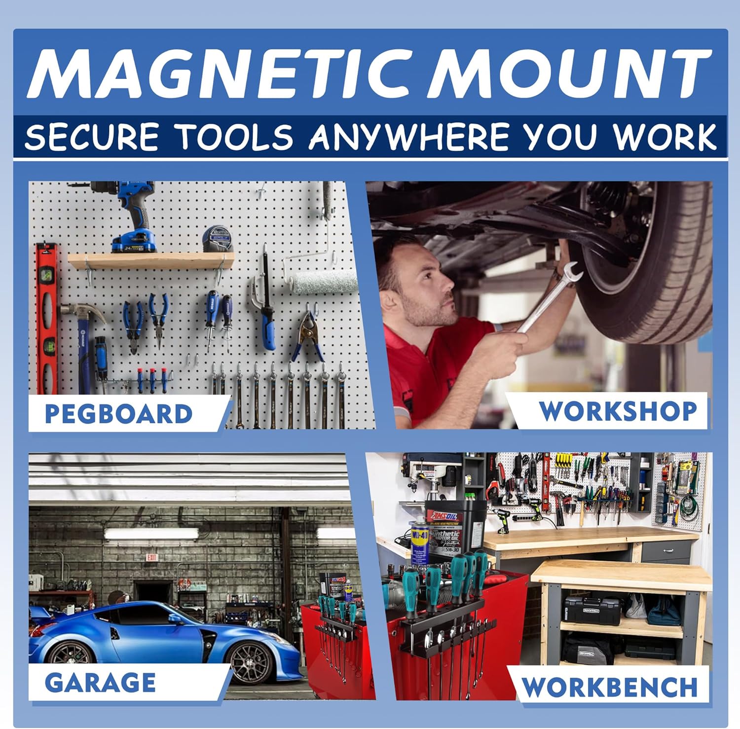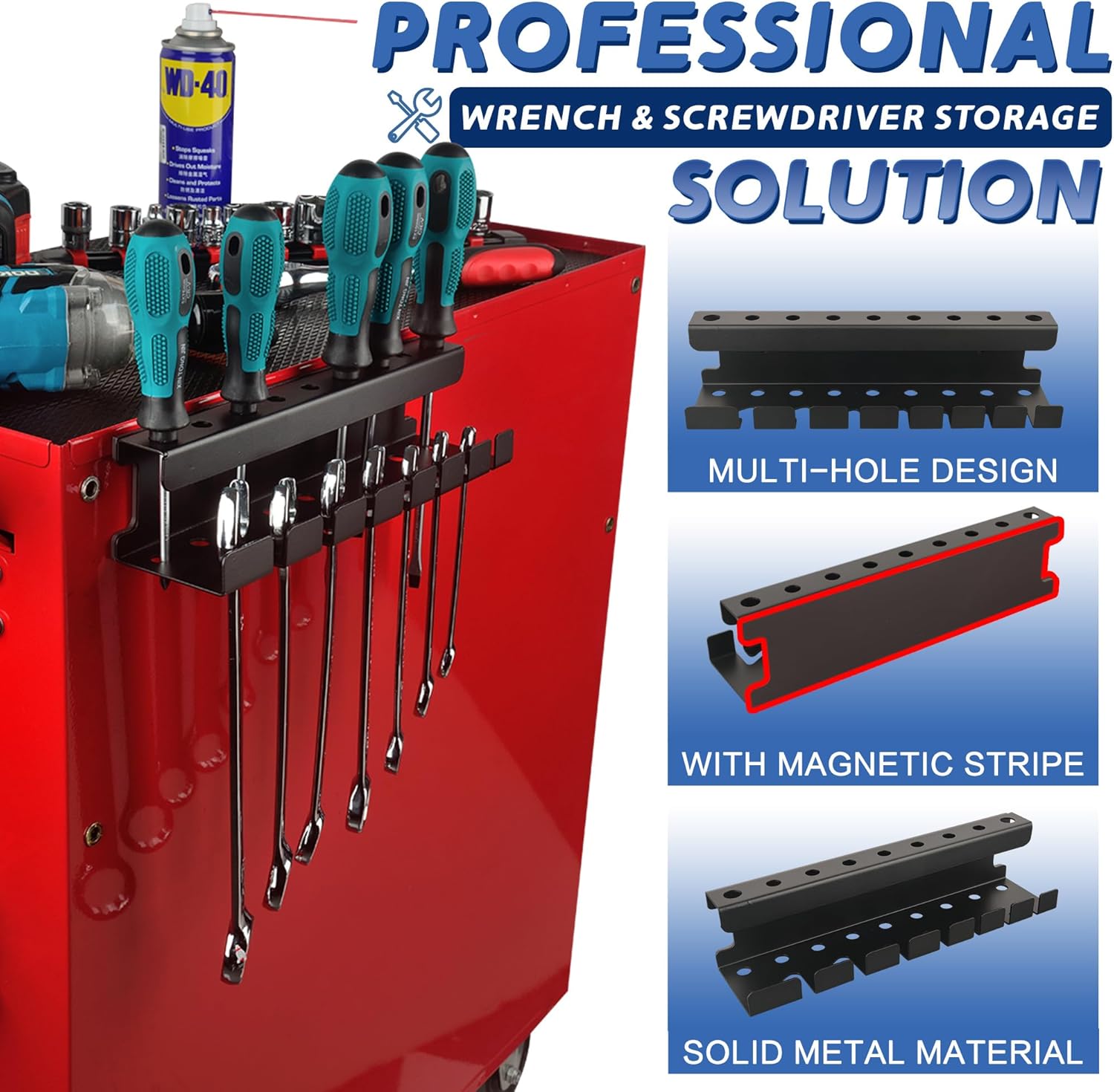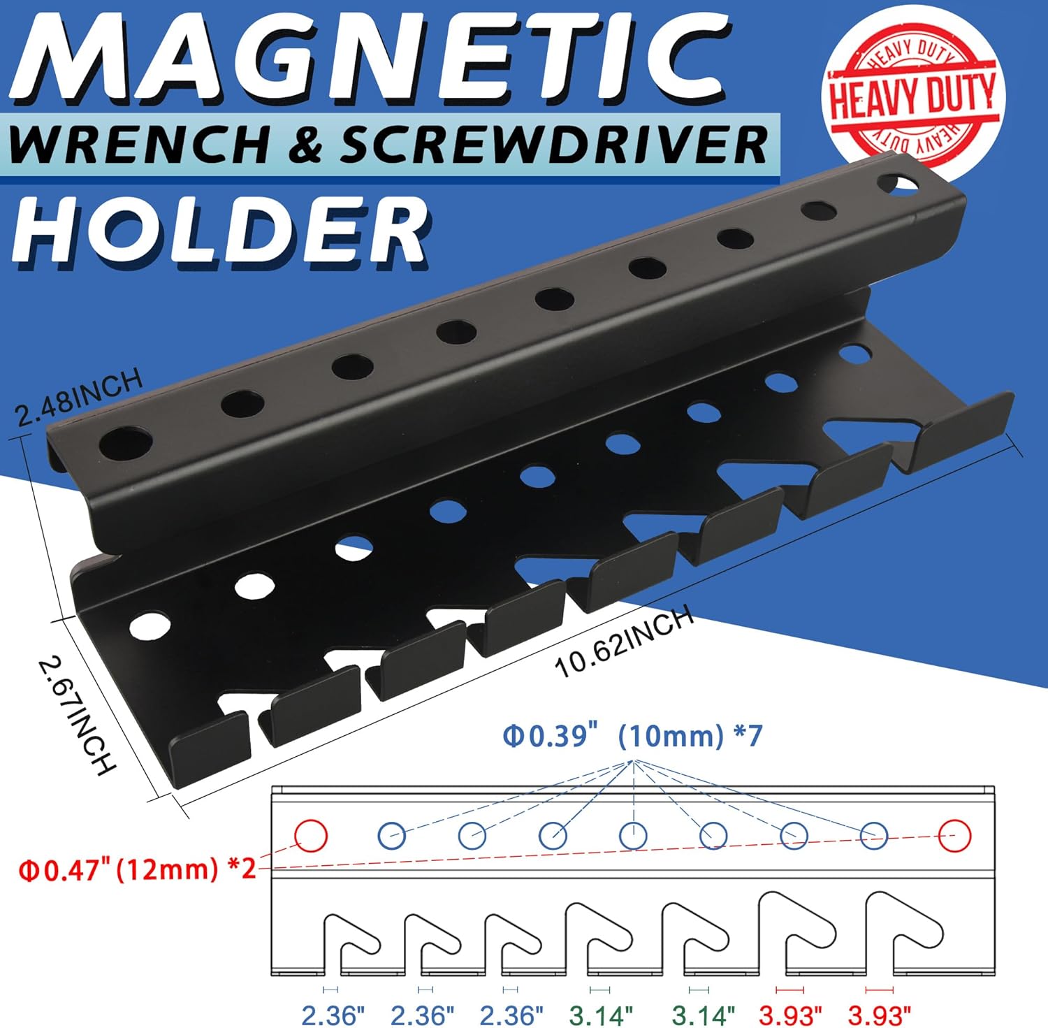 - [Magnetic Wrench Storage Rack]: The Wrench storage rack helps you organize your messy workbench and perfectly arrange Wrench, pliers, screwdriver and other tools. No more digging through a messy toolbox