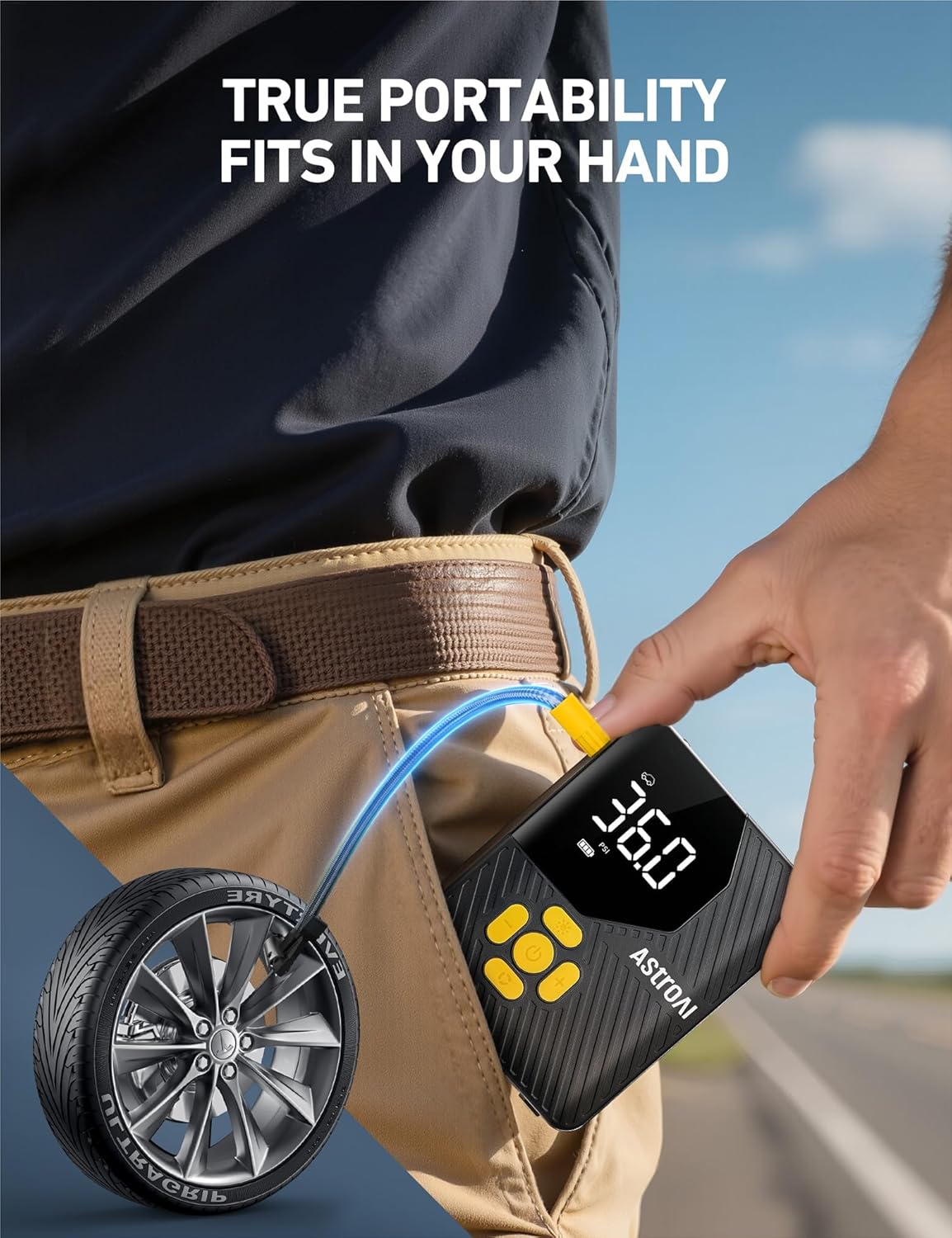 AstroAI L7 Mini Tire Inflator Portable Air Compressor,150 PSI Cordless Car Tires Air Pump with LED Lights&Pressure Gauge,Auto Shut-Off - Tire Pump for Auto,Motorcycle, Bicycle, Ball Yellow