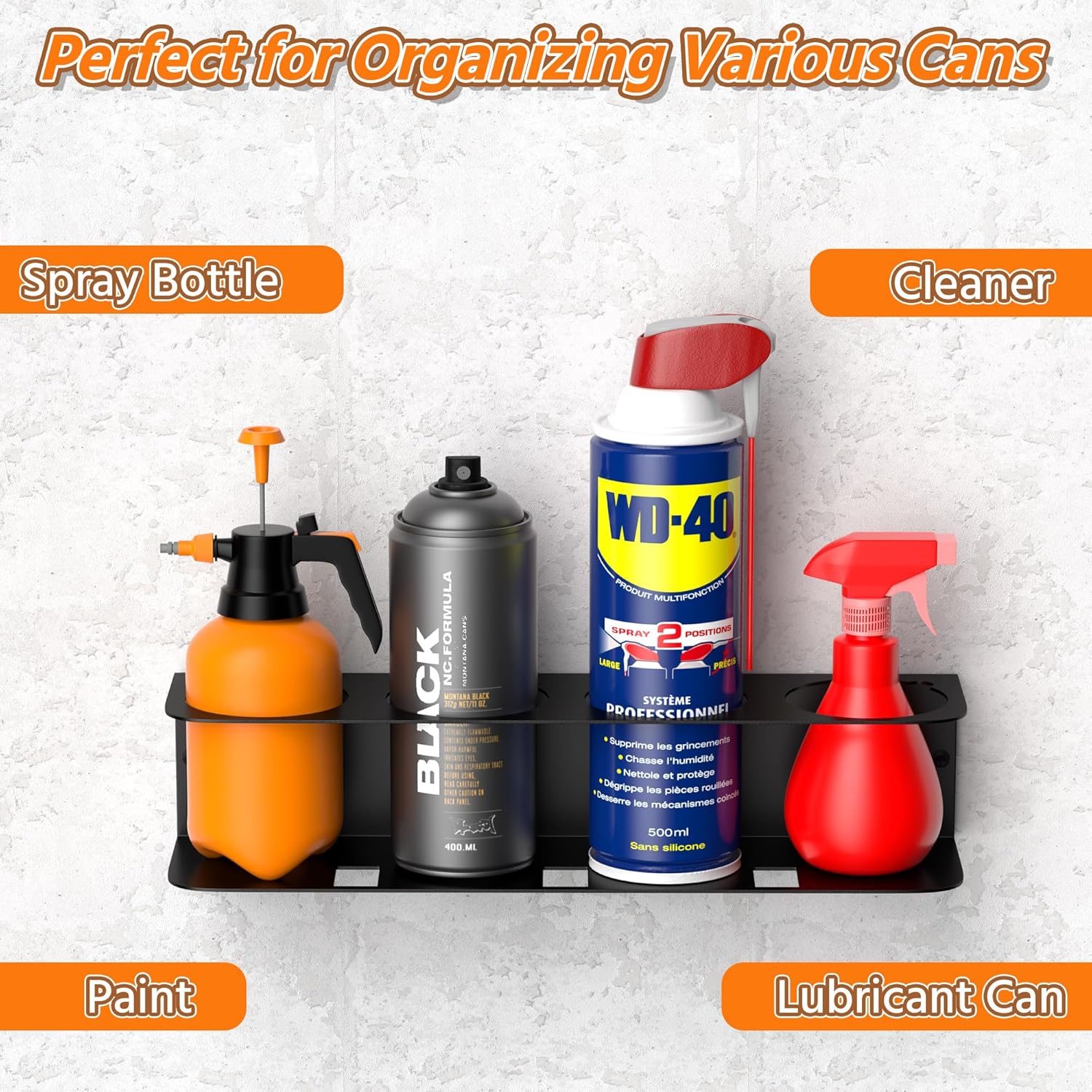 - EFFICIENT SPACE SAVING: This wall-mounted spray can holder maximizes wall space to keep your workspace tidy and clutter-free. Each set includes 2 racks, holding up to 8 spray bottles, offering compact and efficient storage
