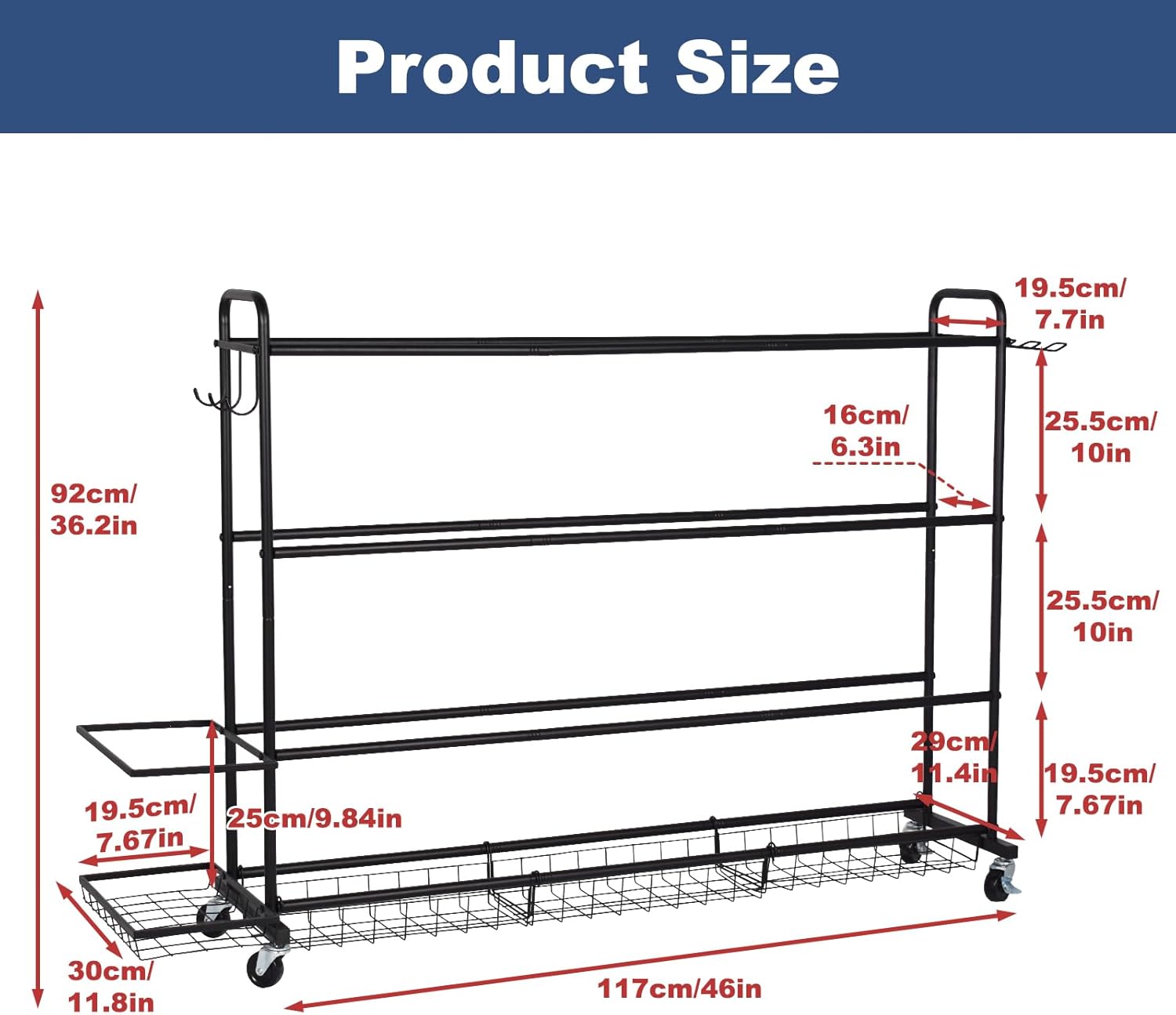 - Keep Organization: Maximize your space with the 4-layer design that provides ample room for organizing soccer, baseballs, footballs, and volleyballs, keeping your equipment tidy and accessible. And there are three hooks on each side, which can accommodate baseball bats, caps, helmets, rackets, gloves etc. The net basket at the bottom can be used to store small sports equipment, such as rugby, baseball, tennis ball, pickleball etc. Side frame can be store yoga mats and foam shafts