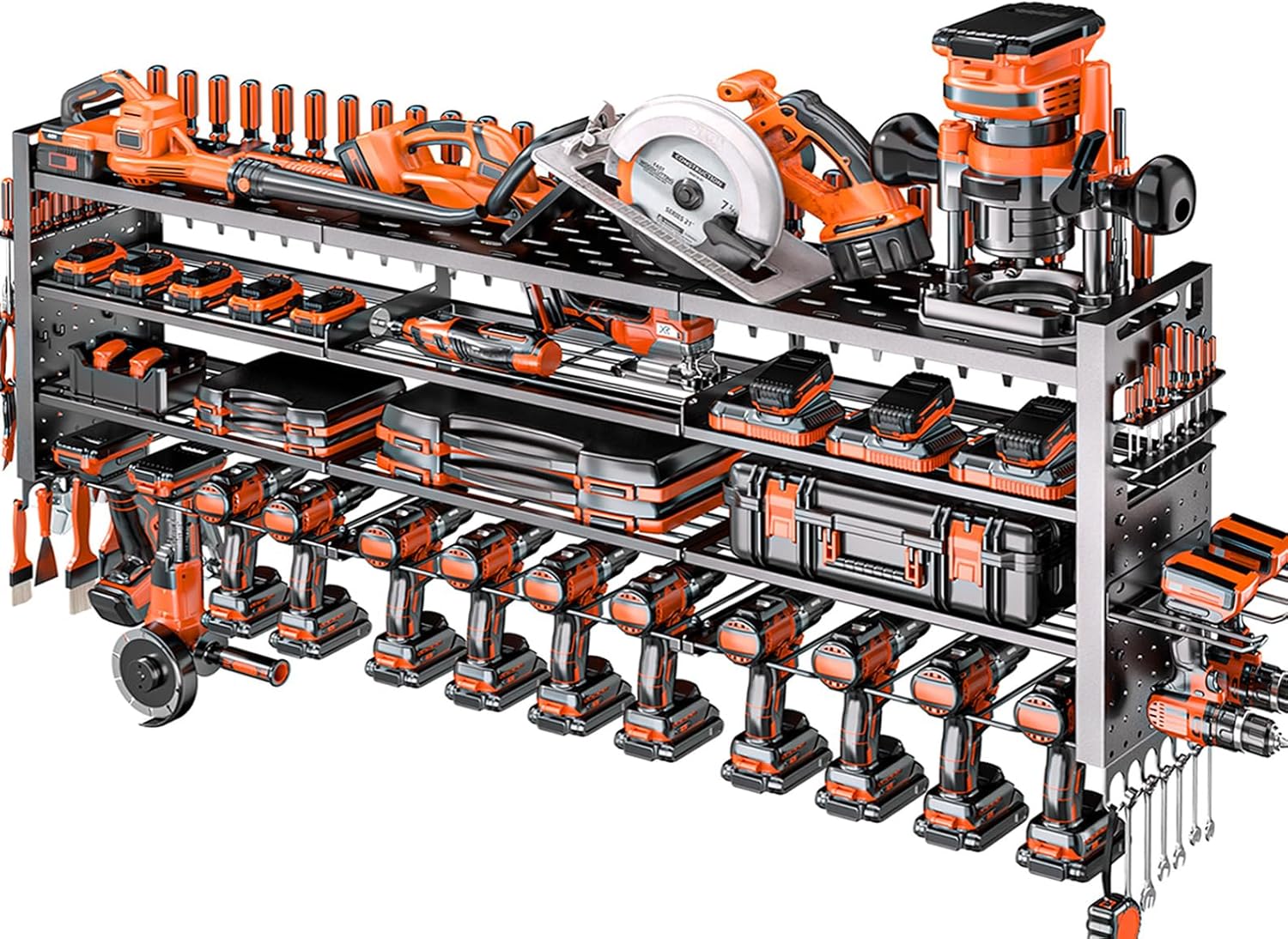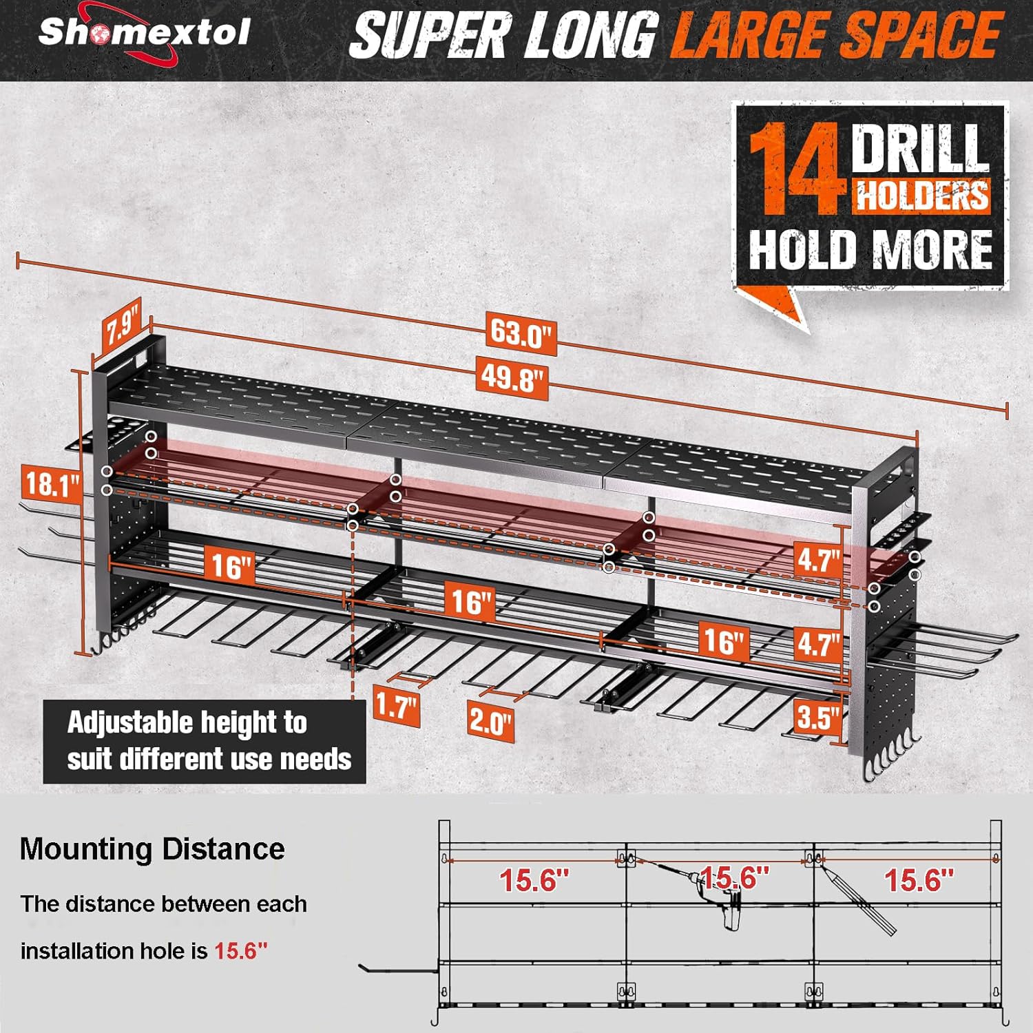 - 4-Layer Capacity &14 Drill Holders: The tool storage organizer offer 3 fixed layers and 1 adjustable layer, versatile storage options, and efficient organization of various tools and equipment; 4-Layer capacity design with 14 cordless drill holder; The garage organization is equipped with perforated panels on both sides, adding plenty of hanging space to easily organize your toolbox, drills, chargers, batteries, hammers and screwdrivers.