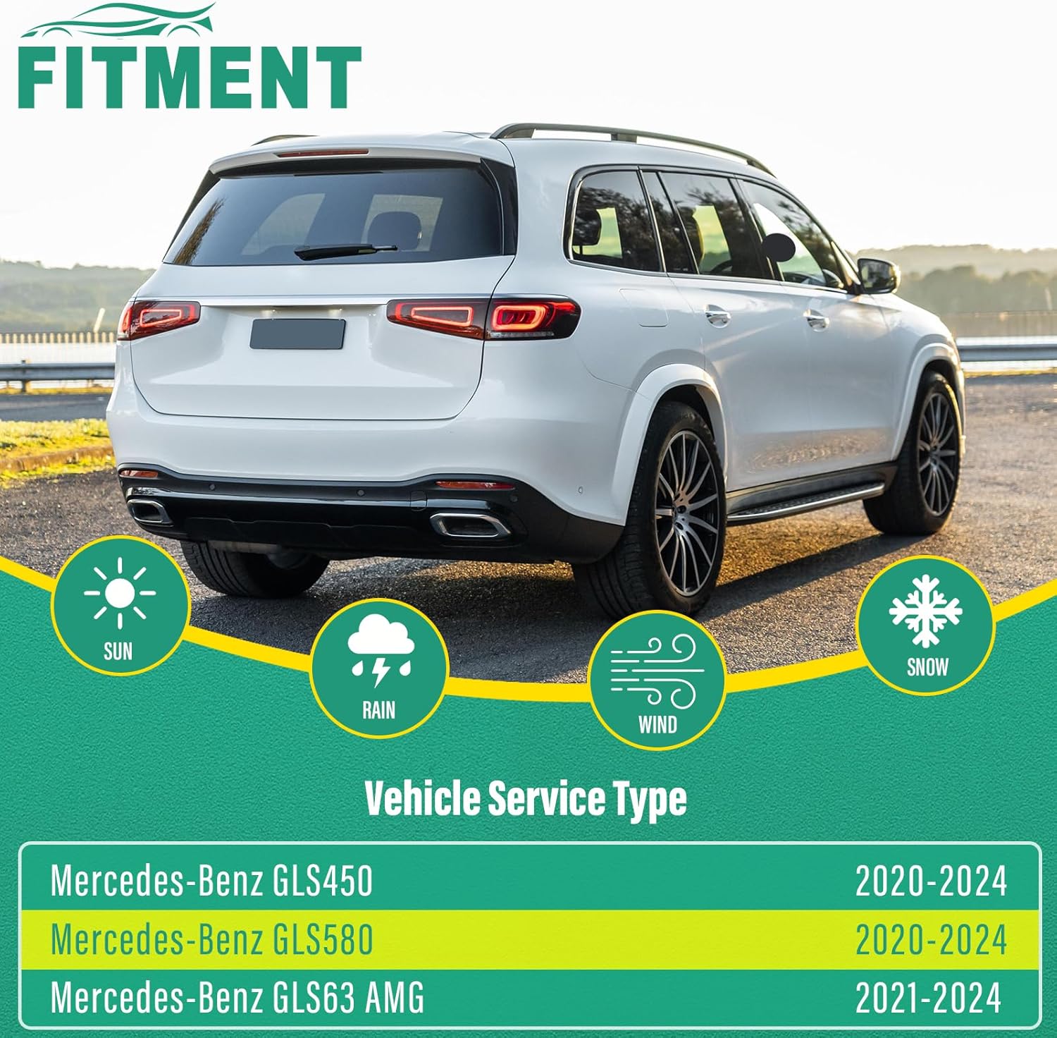 - [FITMENT3]: Replacement for 2021 2022 2023 2024 Mercedes-Benz GLS 63AMG 26inch + 22inch front with 11inch rear windshield wiper blades.