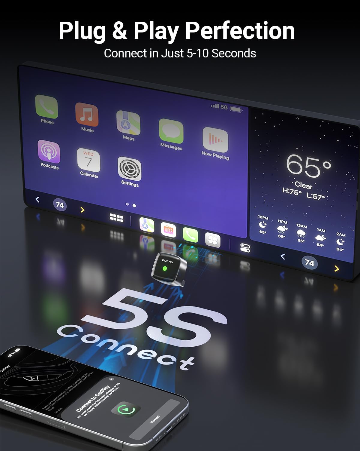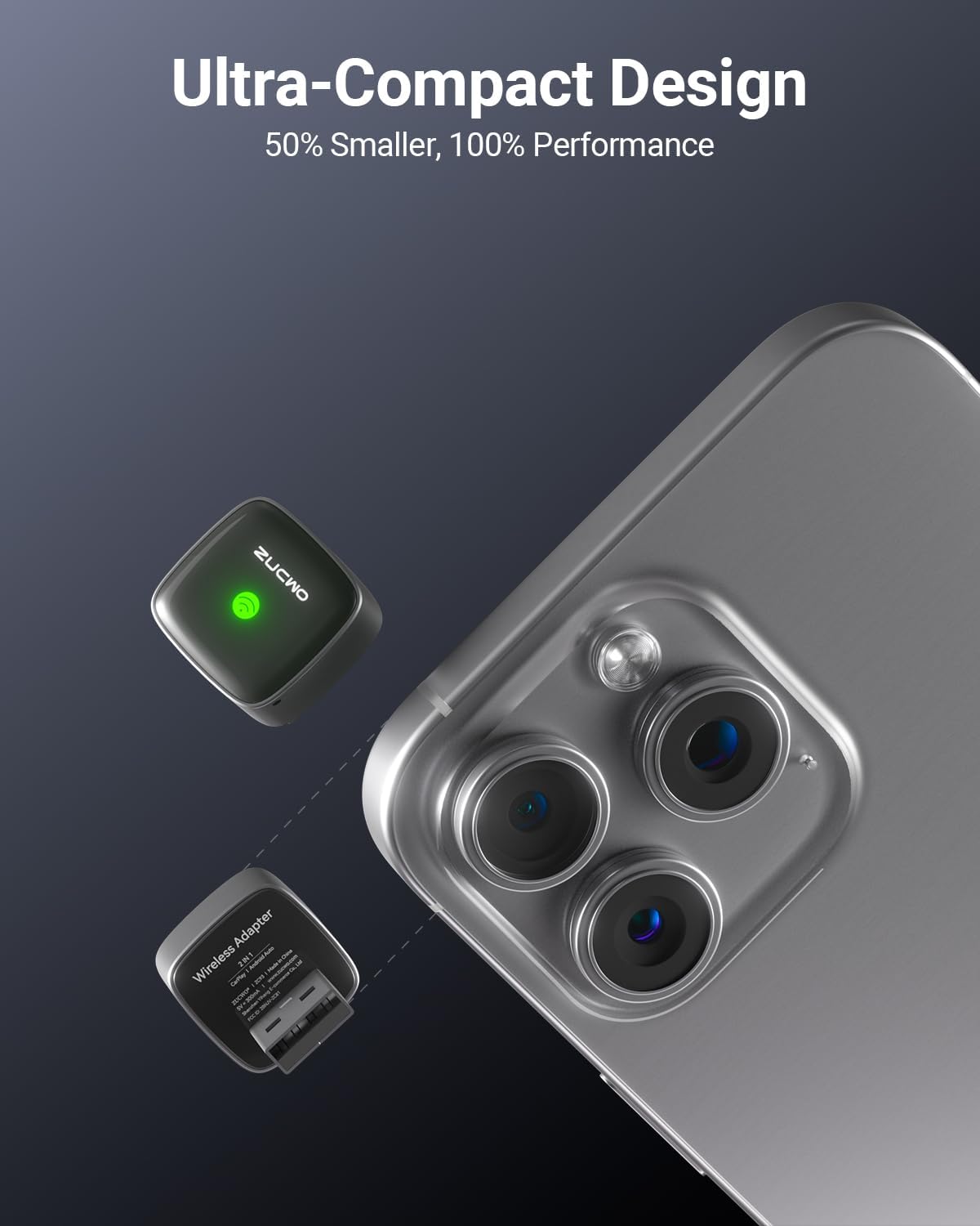 - Ultra-Compact, Clutter-Free Design – This wireless CarPlay adapter is incredibly small—even smaller than a coin. Its space-saving design helps keep your dashboard clean and organized. Once installed, it blends seamlessly into your car’s interior, remaining nearly invisible while delivering full functionality