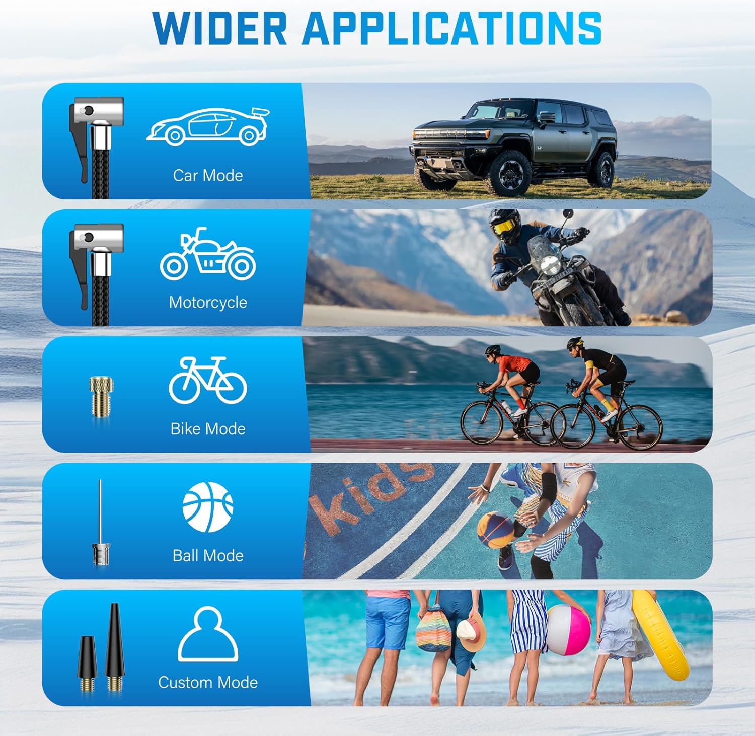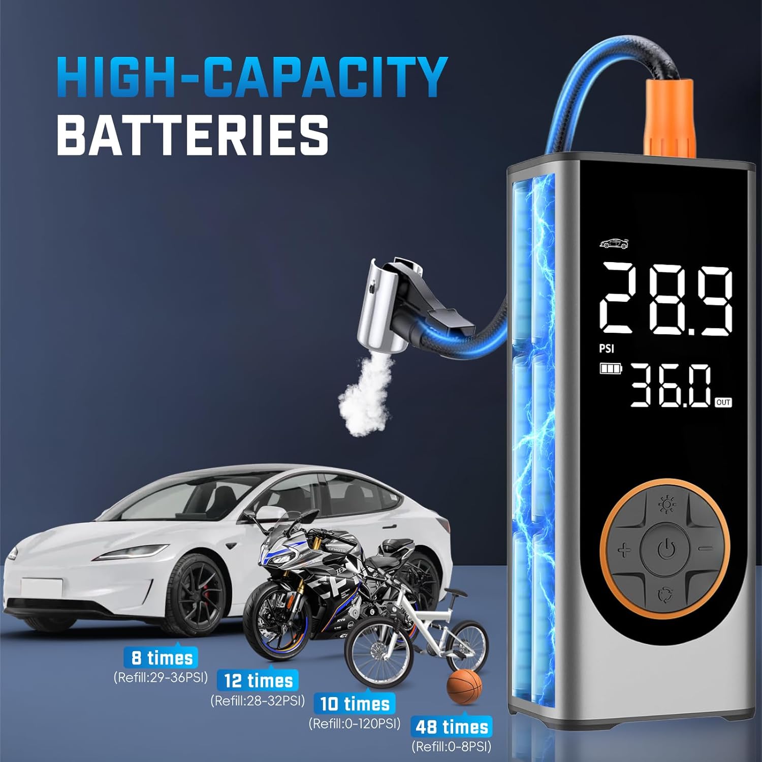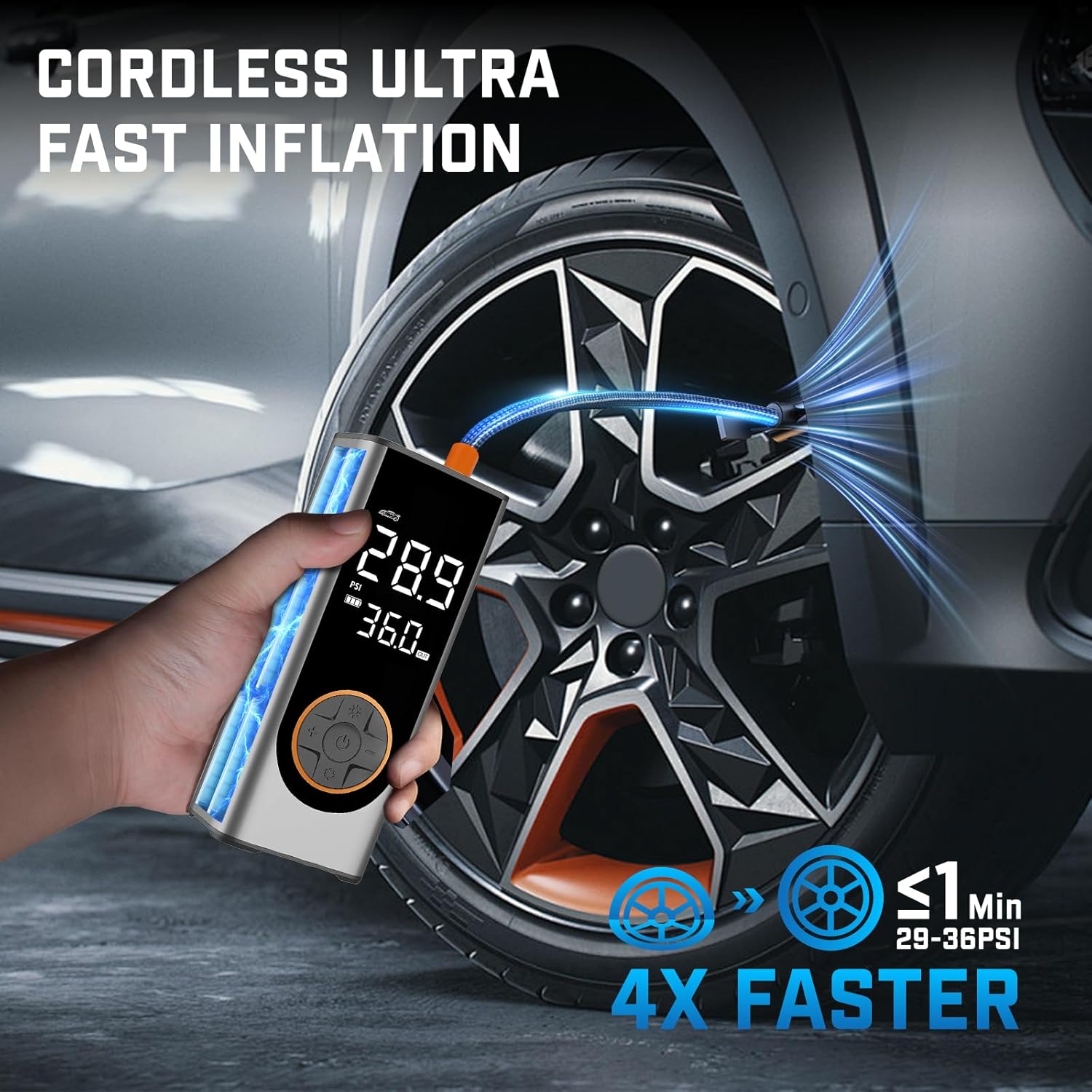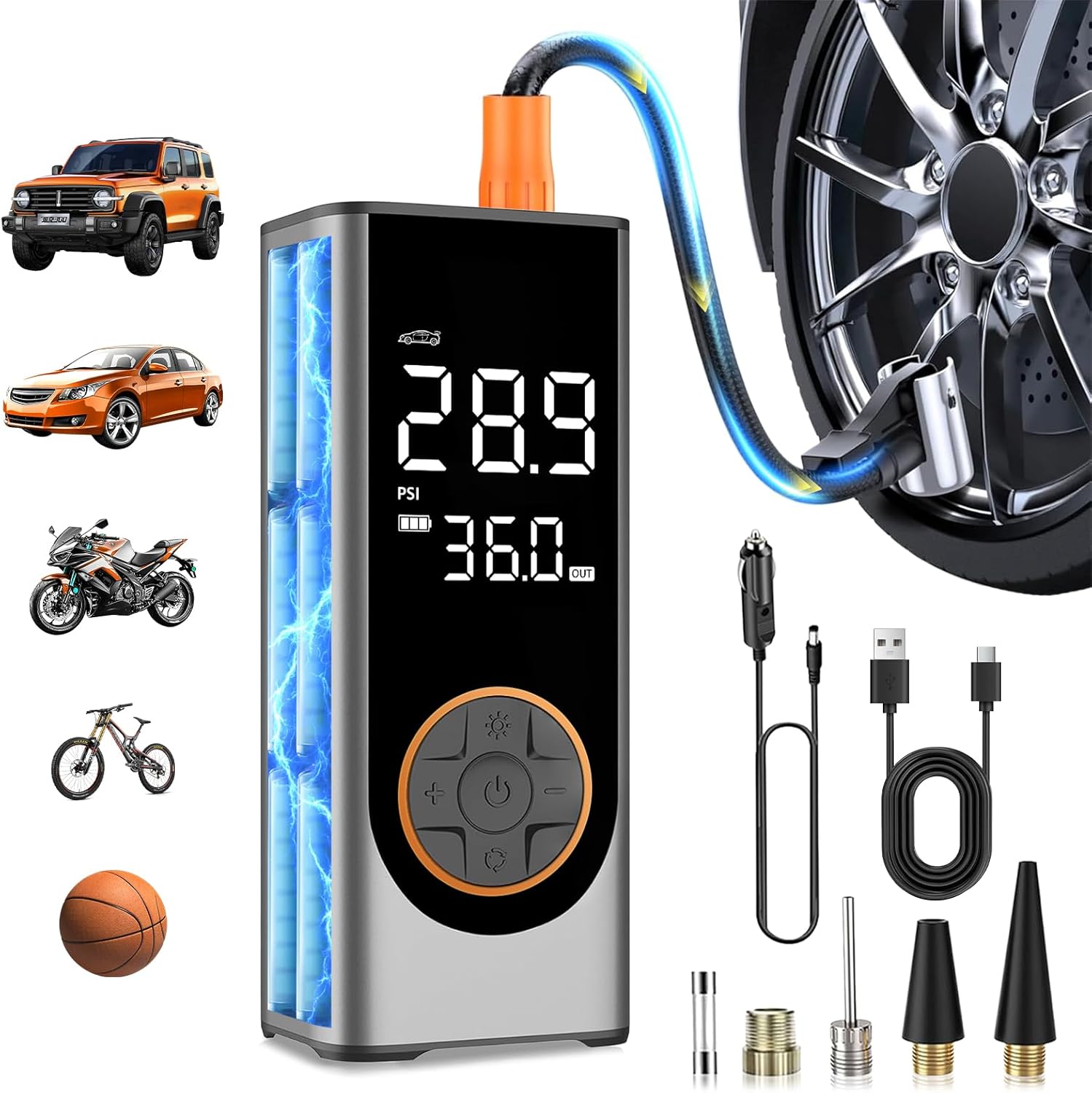 - 🛞 4X Fast Inflation & 5 Modes: This tire inflator portable air compressor delivers a maximum 150 PSI & 35 L/min airflow, inflating a car tire (29-36 PSI) in under 1 min. Features 4 preset modes: car, motorcycle, bike, and ball.