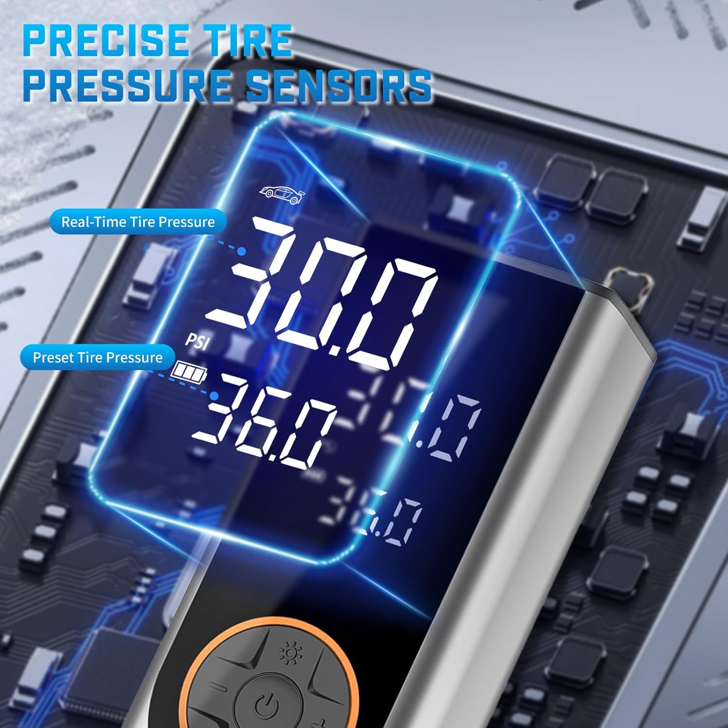 - ✨ Accurate Dual Pressure Display: Featuring a clear display screen, the portable air compressor shows real-time and preset pressure values, automatically shutting off when the preset pressure is reached. Four pressure units: PSI, KPA, BAR, KG/CM².