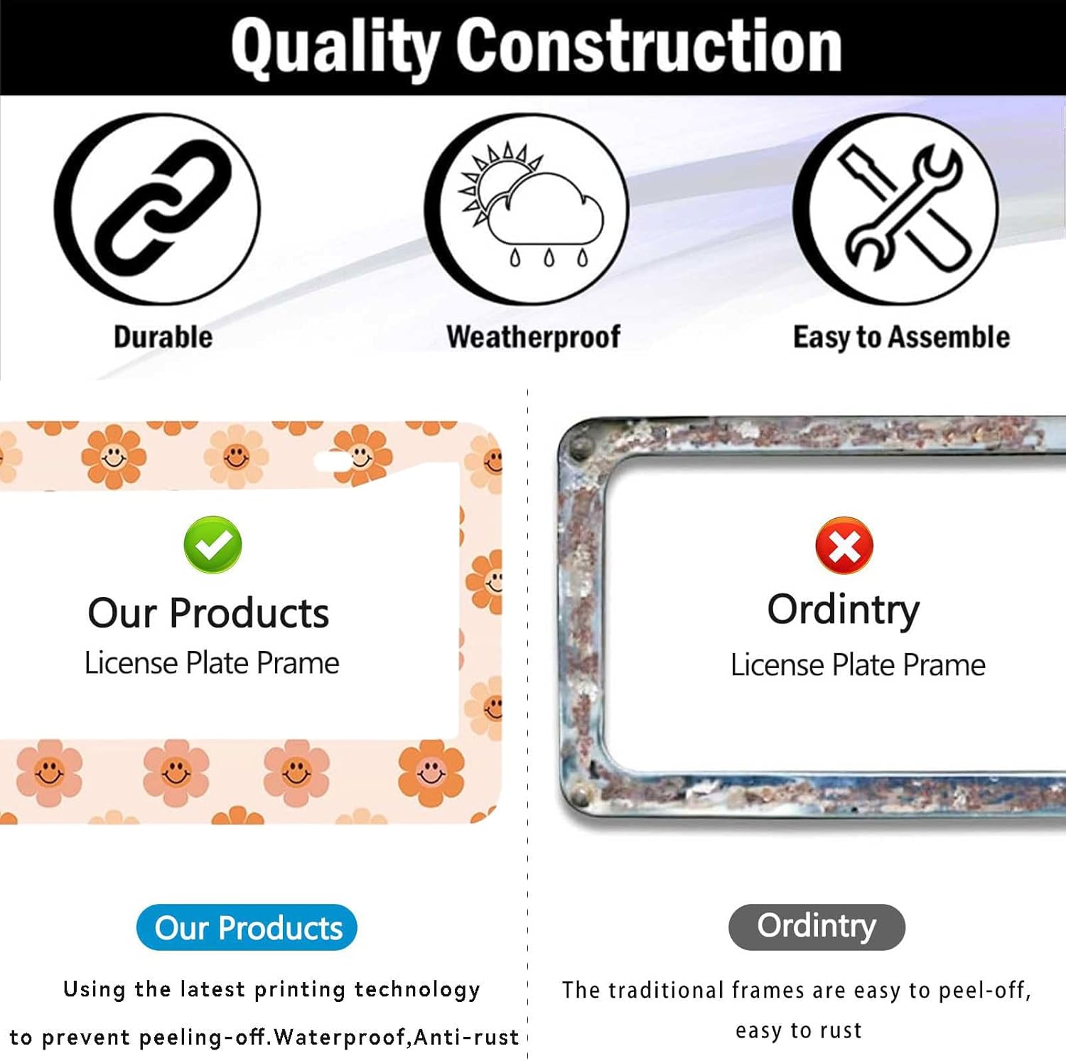 - DURABLE CONSTRUCTION: Made from premium quality metal with weather-resistant coating.Rain or Shine, Stay Secure – Our Rust-Proof Smile Flower License Plate Cover Frame Won’t Budge at Any Speed!
