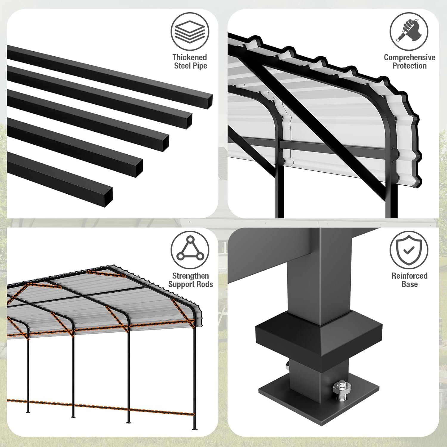 - DURABLE STRUCTURE SUPPORT: This heavy-duty metal carport features a thickened galvanized steel top and frame, which is not only waterproof and UV-resistant, but also not easy to rust, and ensures the stability of the overall structure. The outdoor metal carport is made of high-quality 2" x 2" powder-coated steel pipes, which are sturdy and durable and can easily withstand various weather conditions.