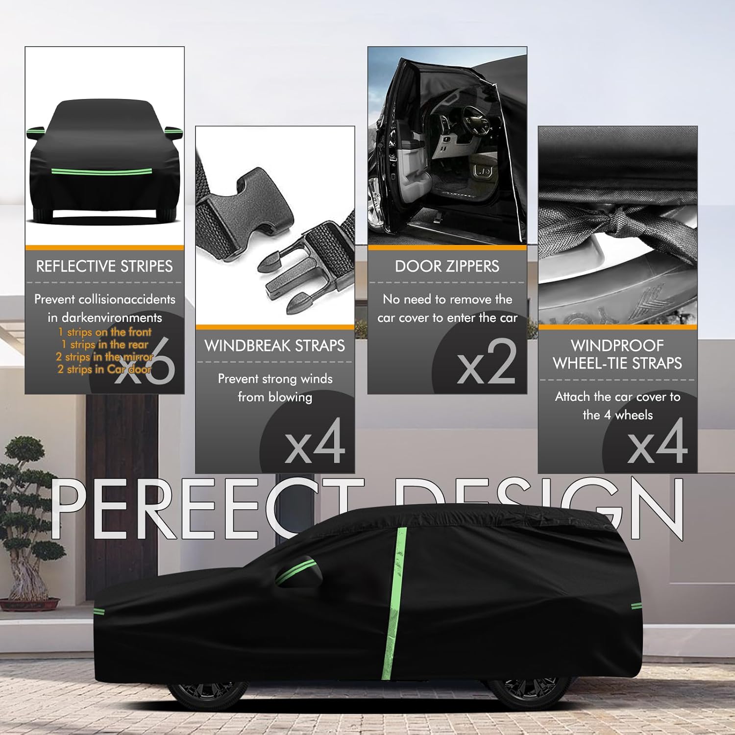 - 🚘【Upgrade Windproof Design】①A windproof fixed buckle pass through the middle of the car for easy fixing; ②Windproof belts at the front and rear; ③4 straps to tie the cover to the four wheels; ④Elastic band at the bottom can easily adjust the size of the cover; ⑤Double stitching ensures that the cover will not tear easily, making it more durable; ⑥The included safety latch secures the cover. Multiple upgraded designs keep your protective cover from being blown away even in strong winds.