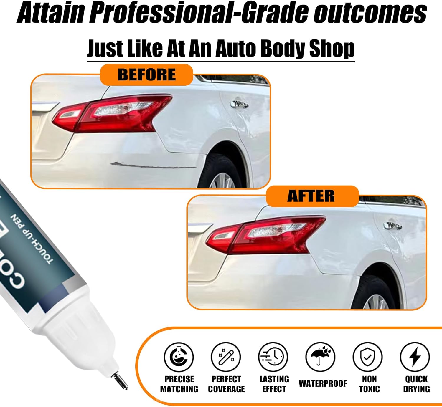 - 【Repair scratches quickly and simply】This car scratch repair paint has strong adhesion, anti-rust, and waterproof properties that protect your car's surface from further damage. With a 2-in-1 uses design, each bottle of car paint comes with a pen pin and brush, ensuring a hassle-free application