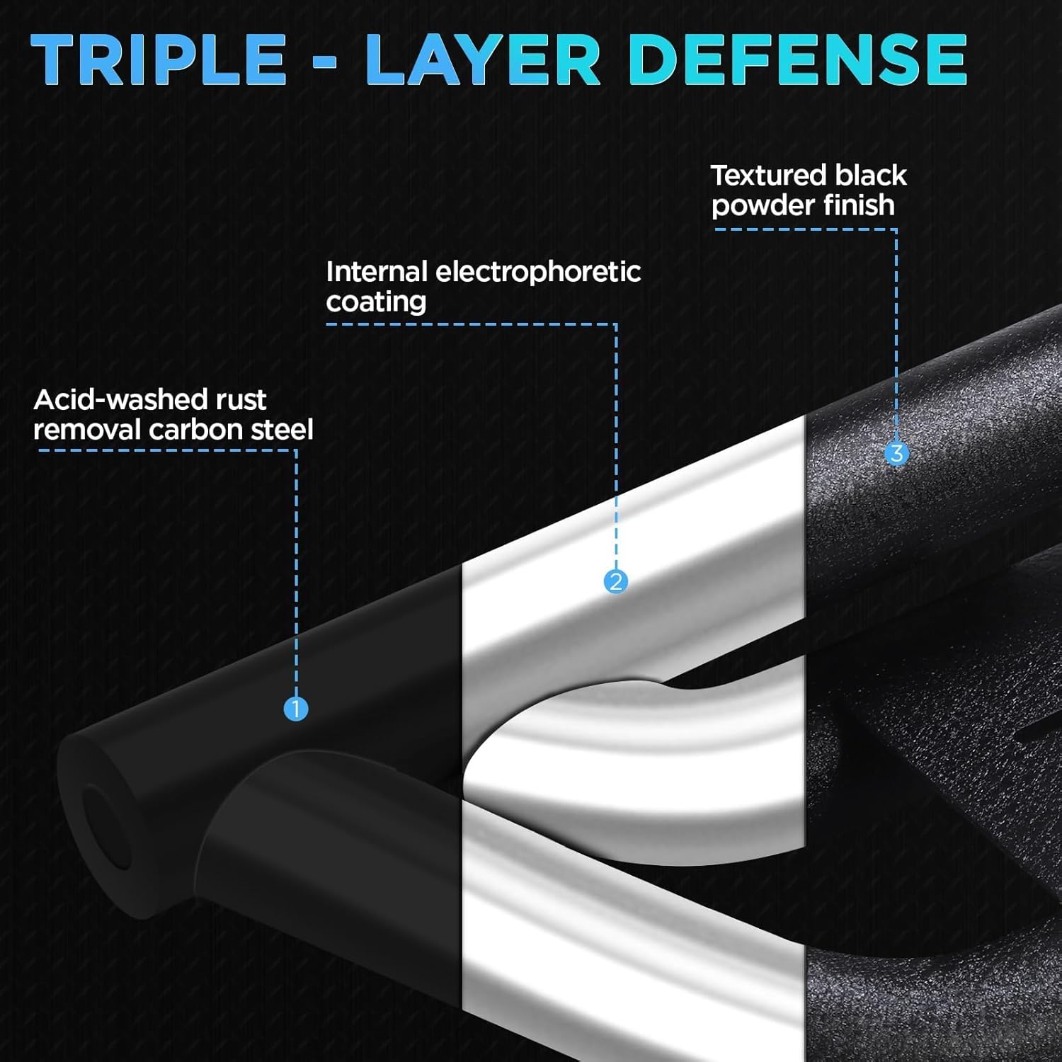 - Durable Carbon Steel: Made from high-quality carboteel and coated with a black powder finish, these side steps are built to withstand harshweather conditions, preventing rust and corrosion for long-lasting durability