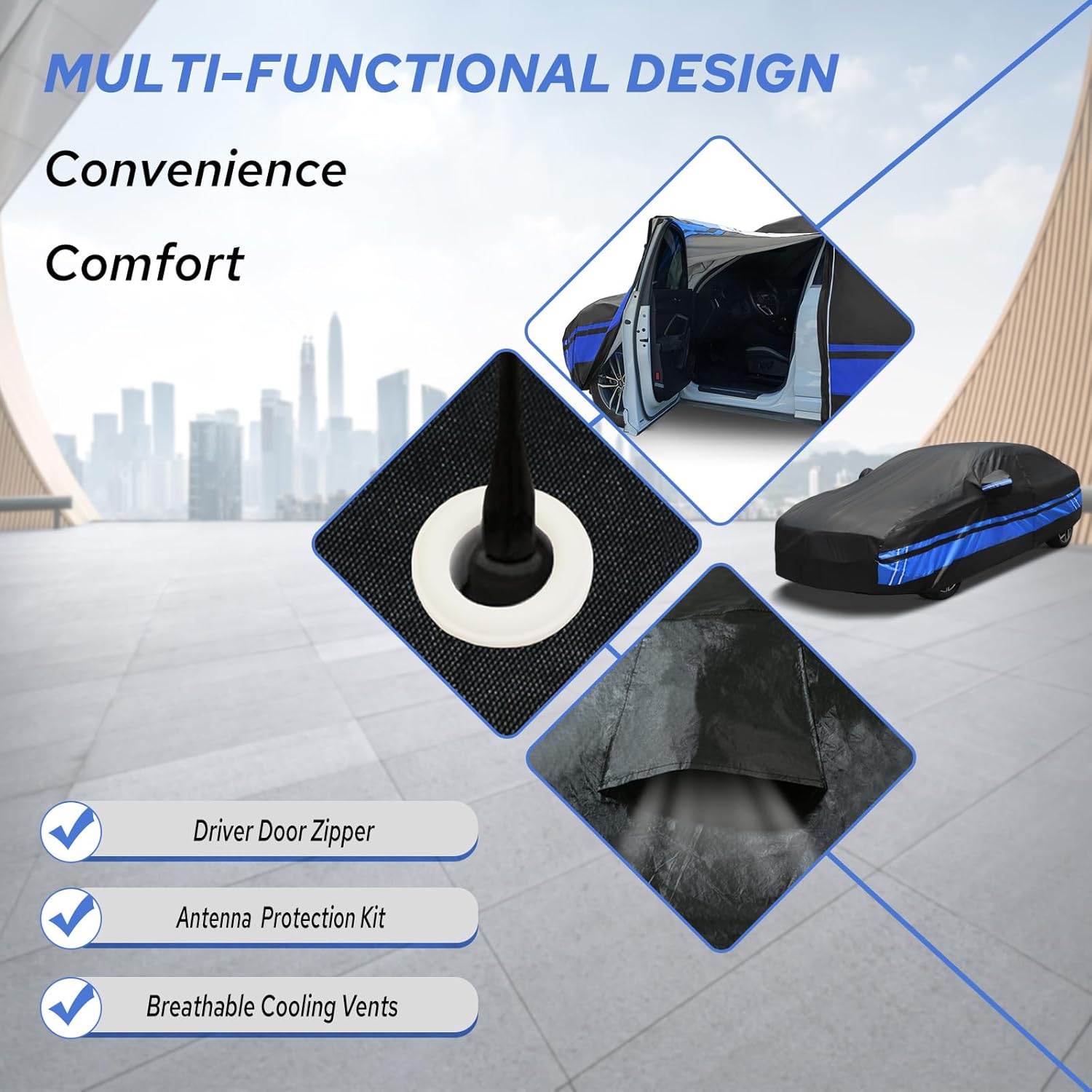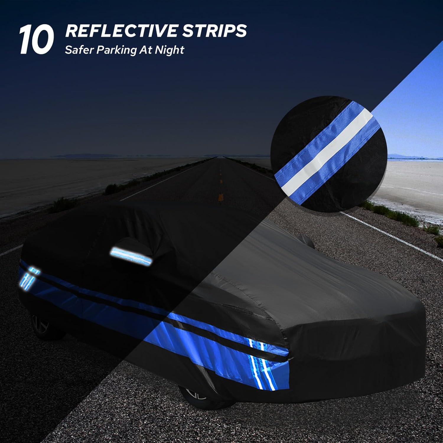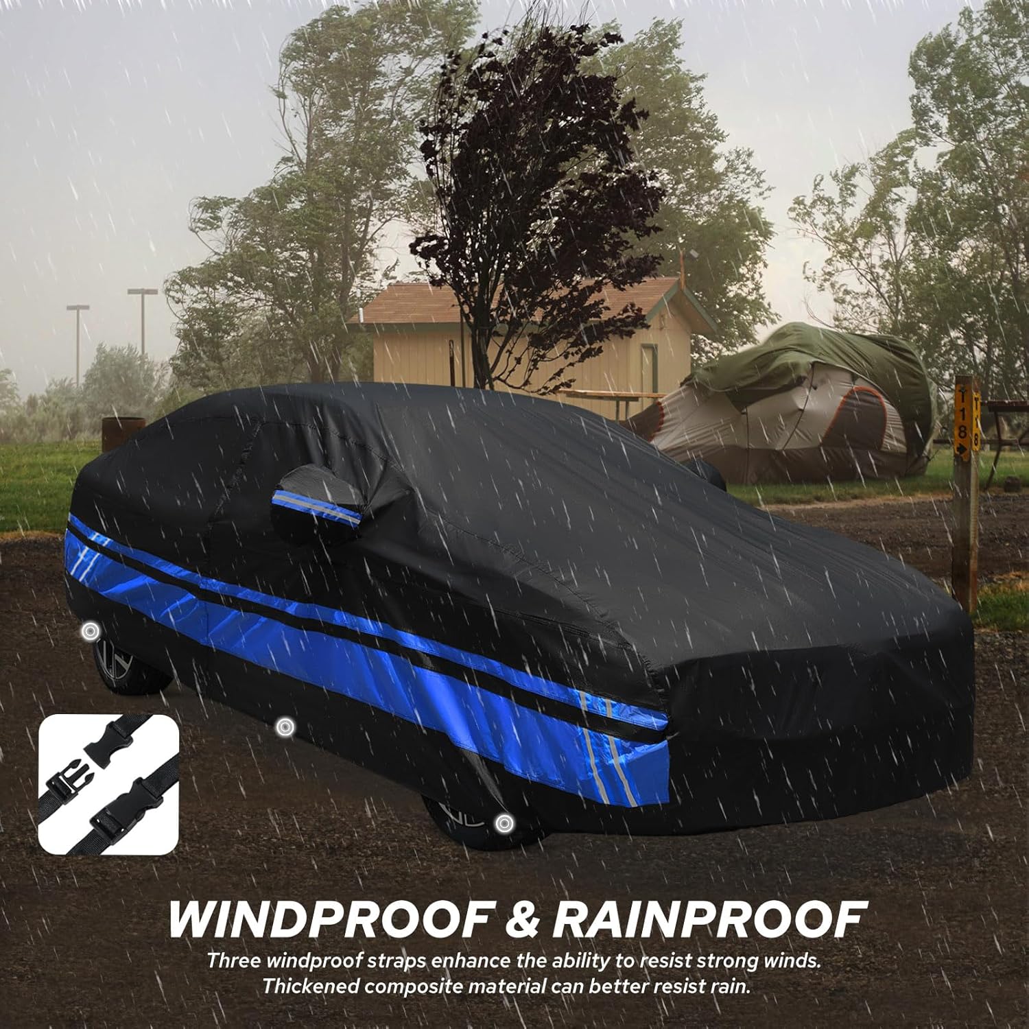 - 【Multi-functional Design】1. The Toyota Corolla car cover has three snap-on reinforced windproof belts in the front, middle, and back to resist strong winds. 2. There is a door zipper on the driver's side for easy access to items. 3. The unique reflective strip design reminds others at night to ensure parking safety. 4. There are vents on the side of the car cover to prevent internal moisture accumulation and keep it dry, allowing for faster ventilation in summer. 5. There is a front logo on the front side of the Toyota Corolla car cover, which can quickly identify the front and rear during installation.