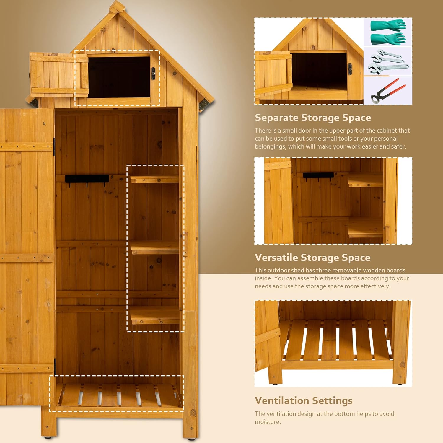 30.3" L X 21.3" W X 70.5" H Outdoor Storage Shed with Waterproof Roof, Solid Fir Wood Frame, and 3 Compartments for Garden Tools, Mower, and Hose,Natural Wood