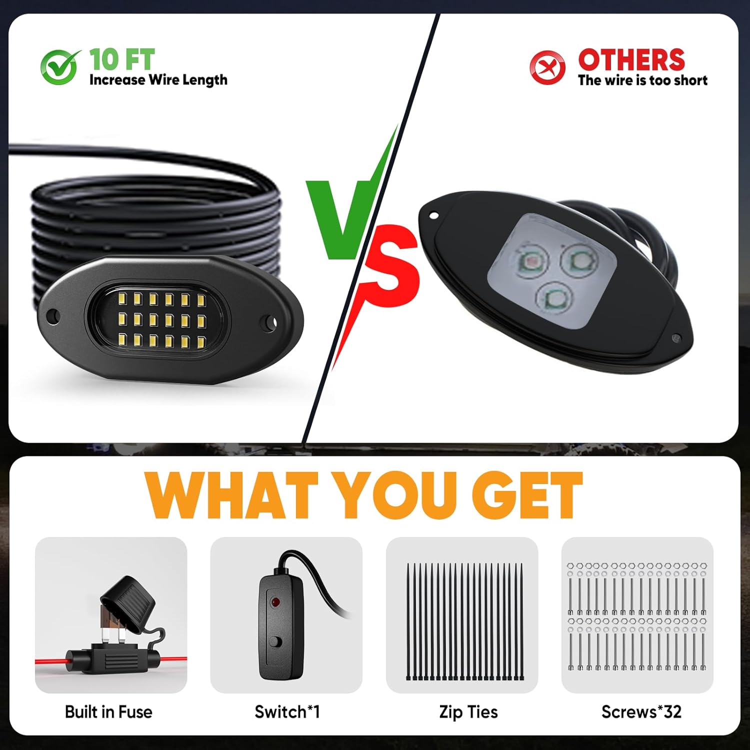 - 【White Rock Lights with Switch】Truck rock lights kits equipped with an easy-to-use switch, you can effortlessly control the pure white rock lights for trucks, allowing you to turn them on or off as needed, helping to conserve battery power