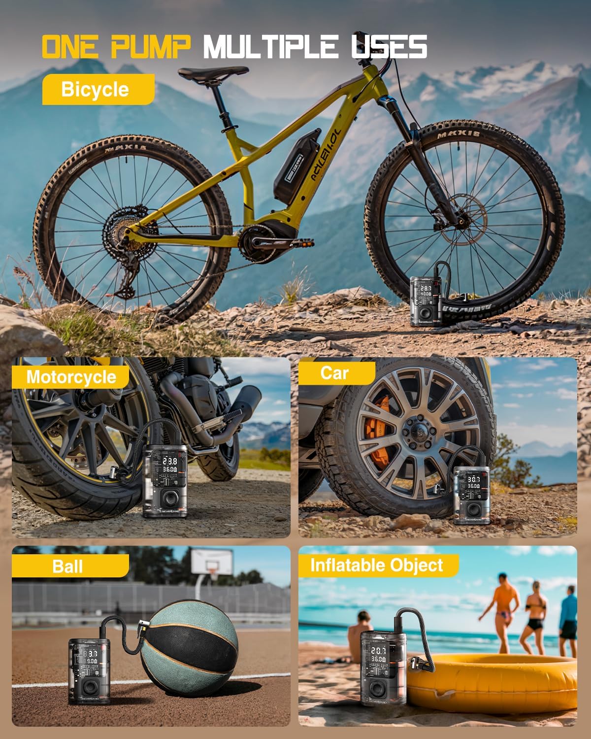 - 【4+N Modes – For All Inflation Needs】 Inflate car, bike, motorcycle tires, and sports balls with 4+N smart modes. Switch to manual mode for up to 150 PSI. This all-in-one portable air compressor ensures accurate and easy inflation for any scenario.