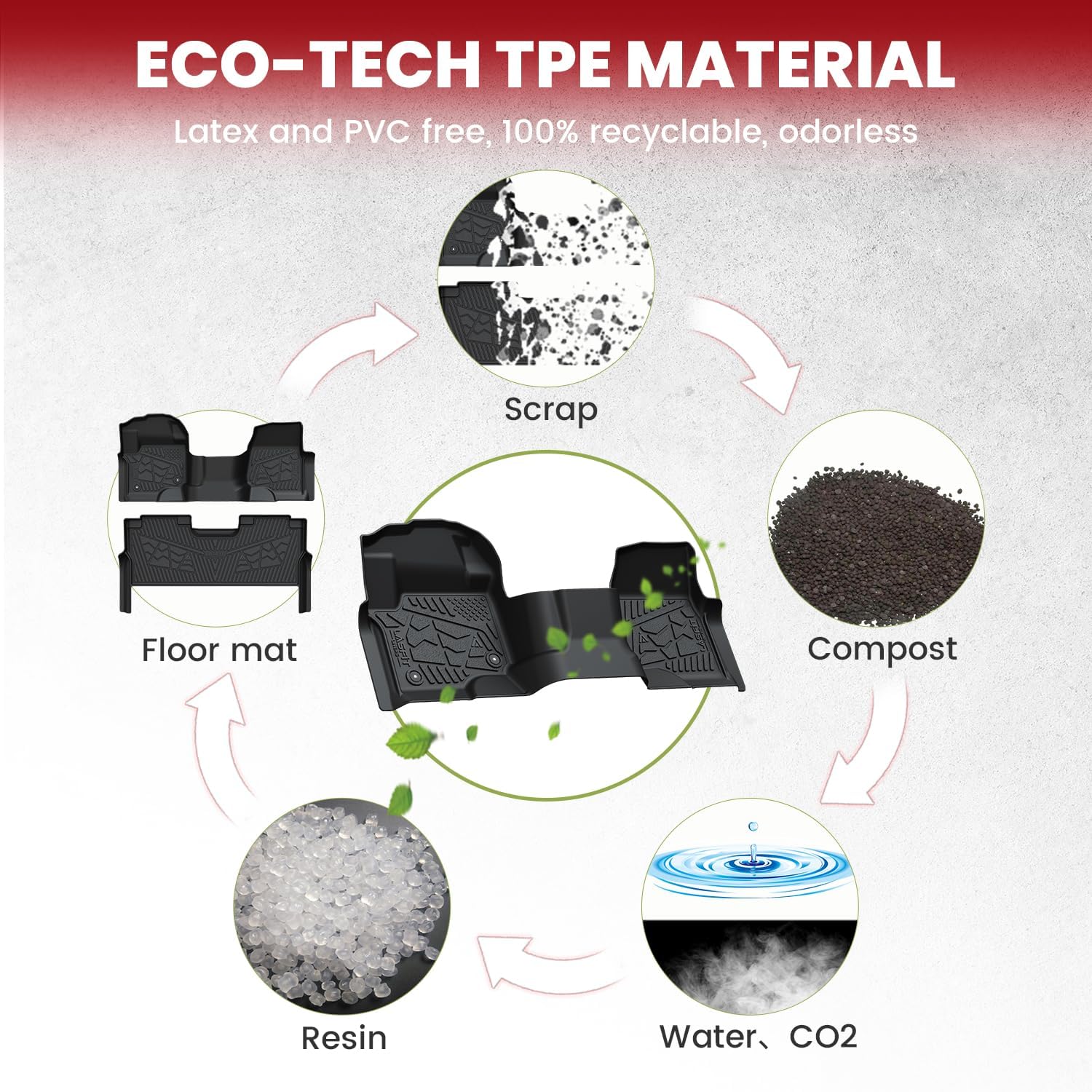 - ENVIRONMENT FRIENDLY- The All Weather F-250/F-350 floor mats use elastic TPE (Thermoplastic Elastomer), No foul odor is produced even at high temperatures. soft touch and exquisite finish. The F-250/F-350 Super Duty Crew Cab floor mats are skid-proof and recyclable.