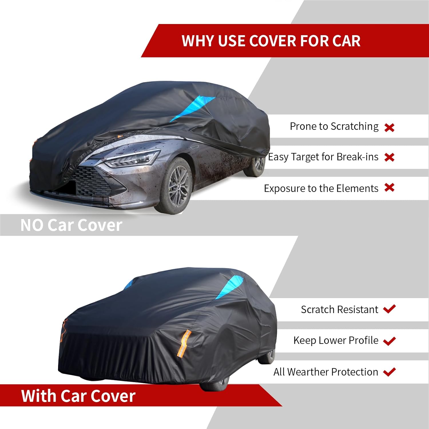 - Choose Fit Cover: The car cover waterproof all weather fits up to 183 inches for sedan. (NOT FOR HATCHBACK AND SUV ). As long as your car does not exceed the applicable length, it can be applied and protected. Please check your car details before you choose the car cover, select the car cover with the corresponding specifications