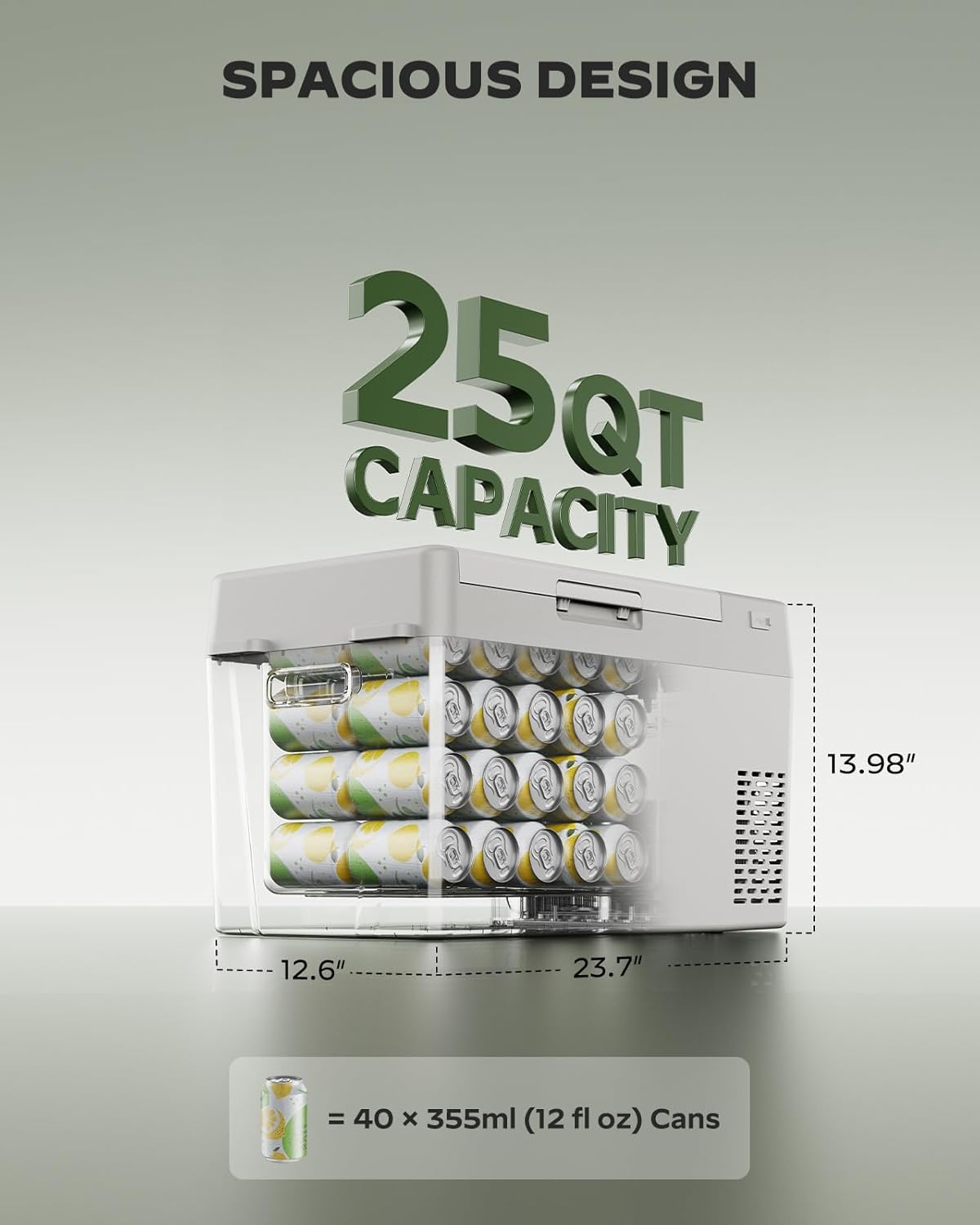 - Compact 25QT Design for Efficient Storage:The 25QT portable freezer offers just the right amount of space for essential foods and drinks, holding up to 40 cans of 330ml drinks. This car fridge is compact, portable, and great for small groups or short trips, providing ample space without taking up unnecessary room.