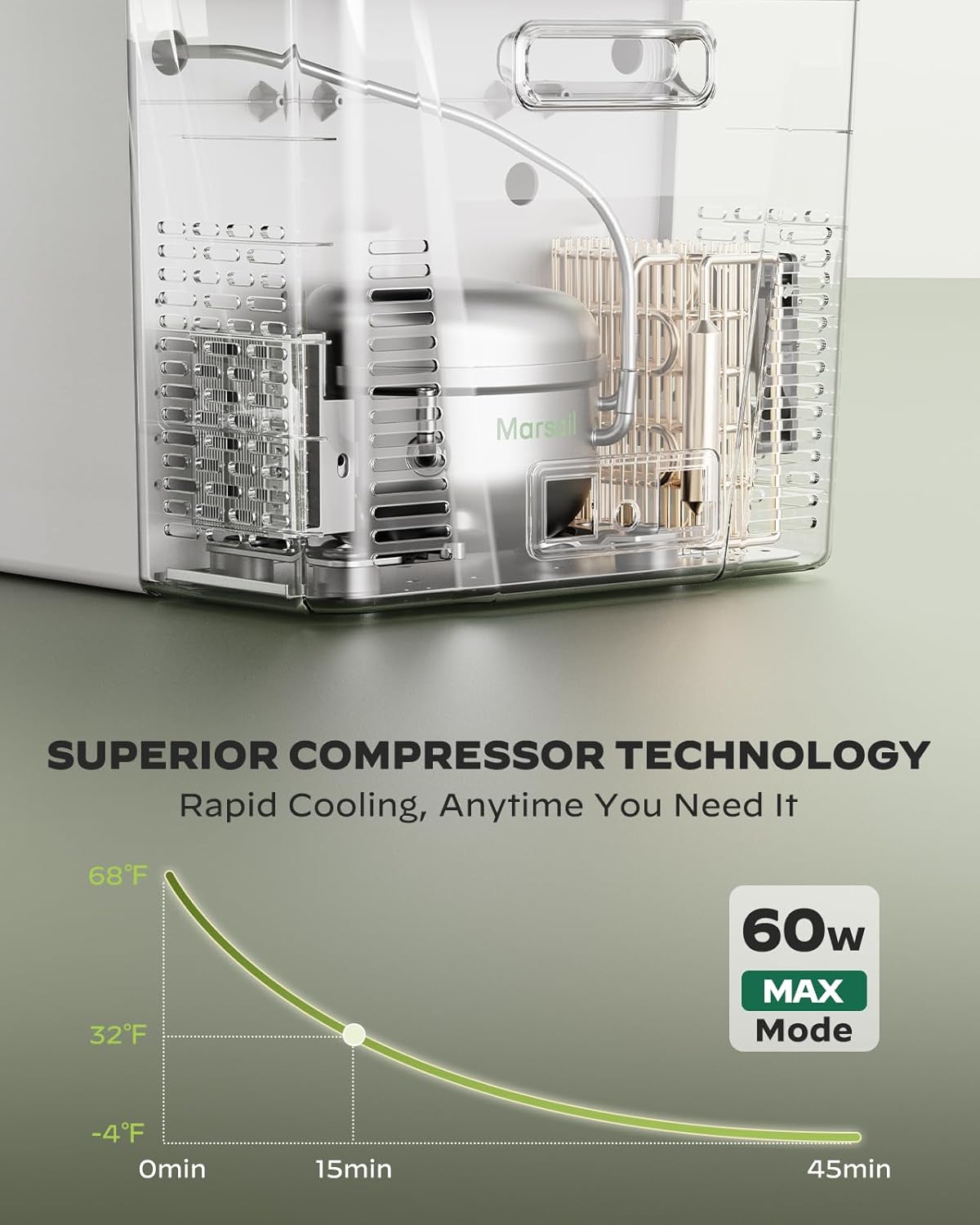 - Efficient Cooling with Compressor Technology:This car refrigerator uses advanced compressor technology to achieve fast cooling, keeping your food fresh or frozen without delay. With two cooling modes—MAX Mode (60W) for rapid cooling, it takes only 15 minutes to bring the temperature from 78°F to 32°F, and MIN Mode (45W) for long-lasting cooling with less power. Ideal for road trips, camping, and outdoor activities, this electric cooler is perfect for all your on-the-go cooling needs.