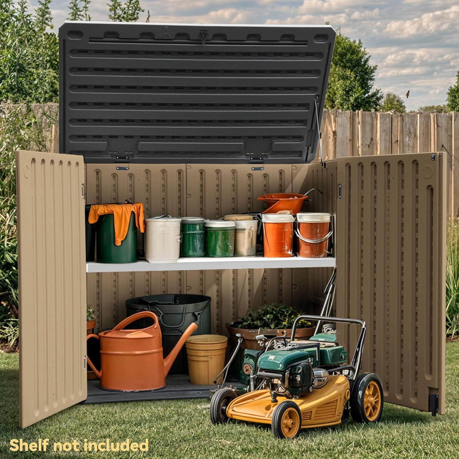 - Spacious & Versatile Storage: With a 35 cu ft capacity (Exterior: 51.1’’L*29.1’’W*41.3’’H, interior: 47.2’’L*25.4’’W*39’’H), this outdoor horizontal storage fits garden tools, a small lawn mower, bicycles, or two trash cans; Add an extra shelf (48" × 13", sold separately) for better organization