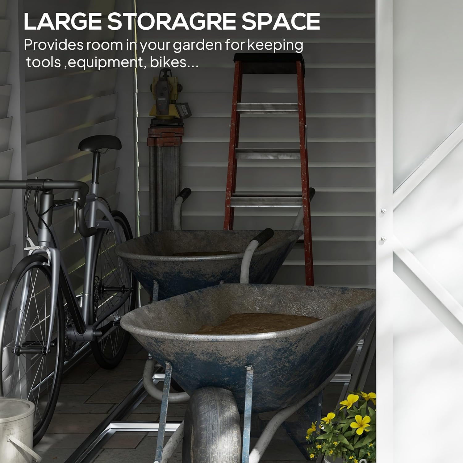 - Outdoor Storage Space: This metal shed brings much storage to your backyard. Store garden tools, put away pool supplies, and lay lawn care equipment